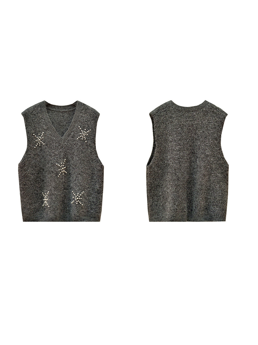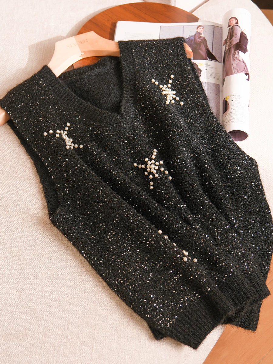 Women Spring Artsy Pure Color Pearl V-Neck Vest