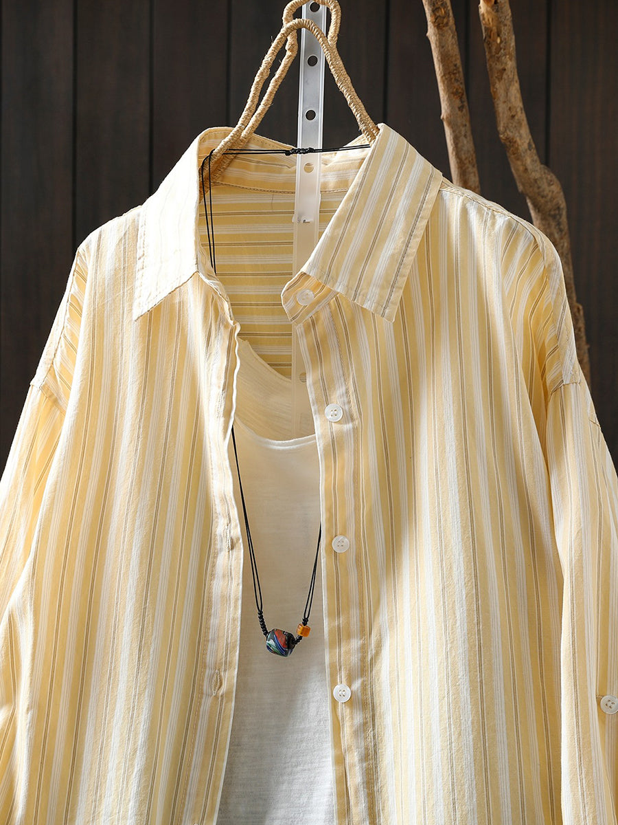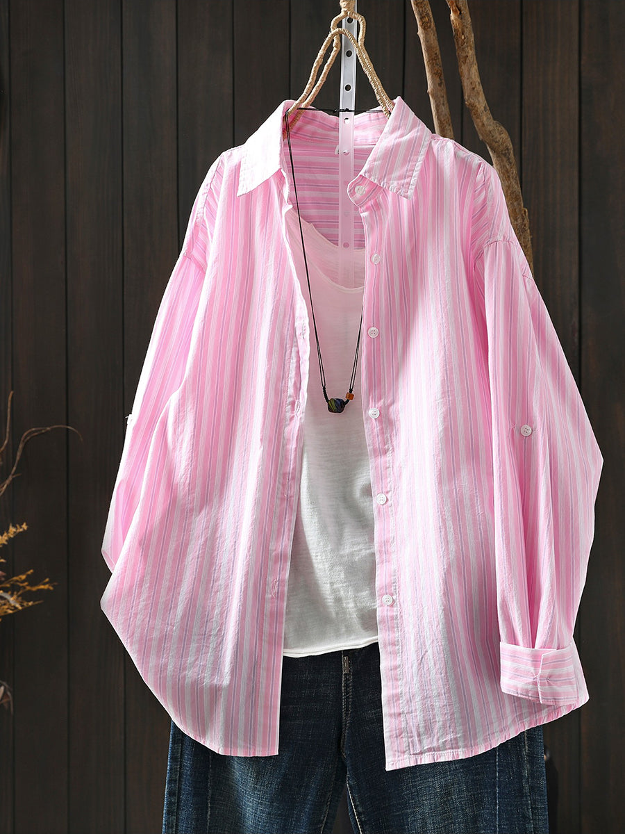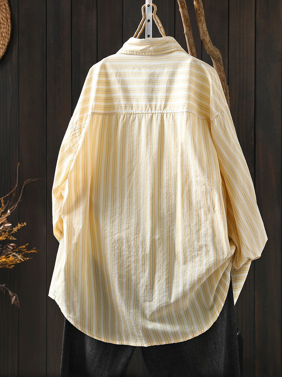 Women Spring Artsy Stripe 100%Cotton Turn-down Collar Shirt