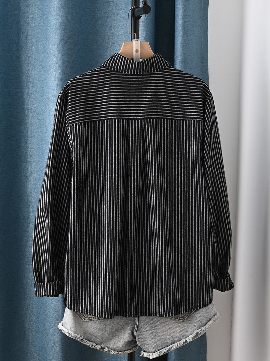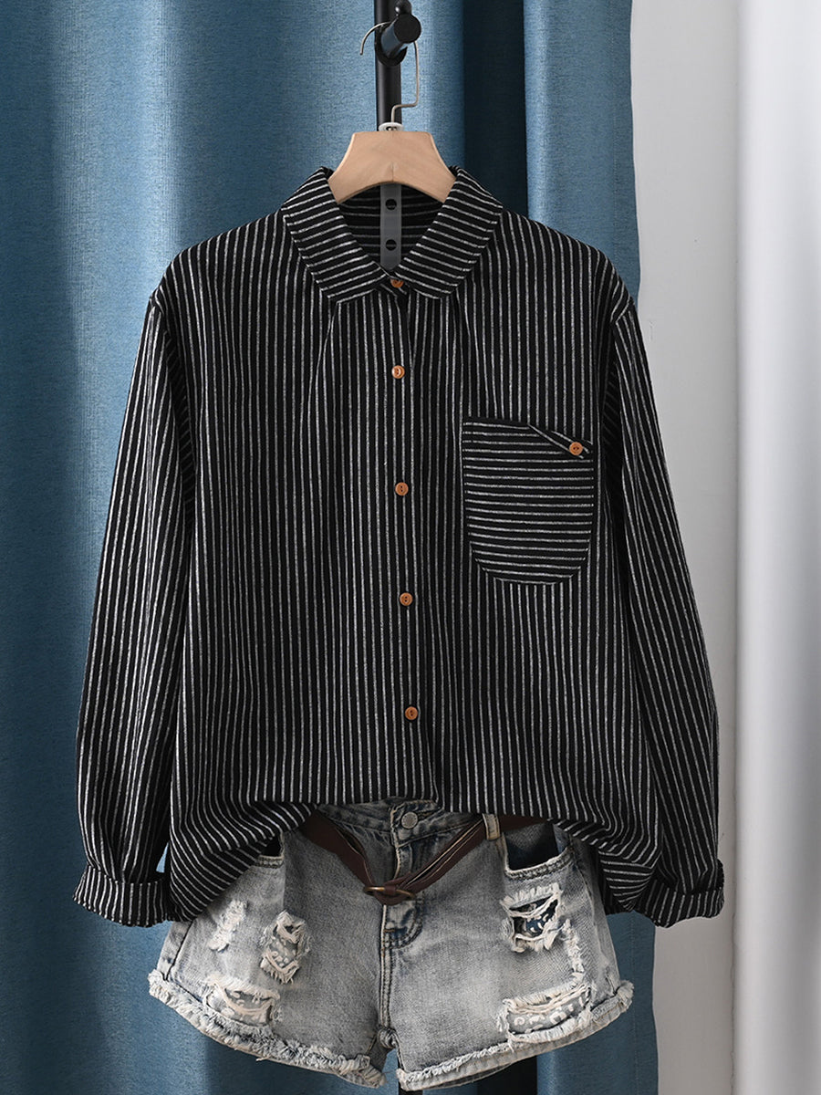 Women Spring Artsy Stripe Turn-down Collar 100%Cotton Shirt