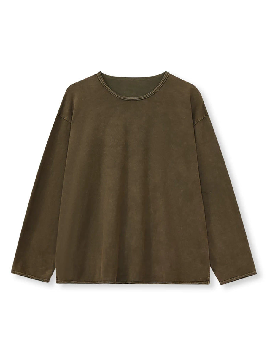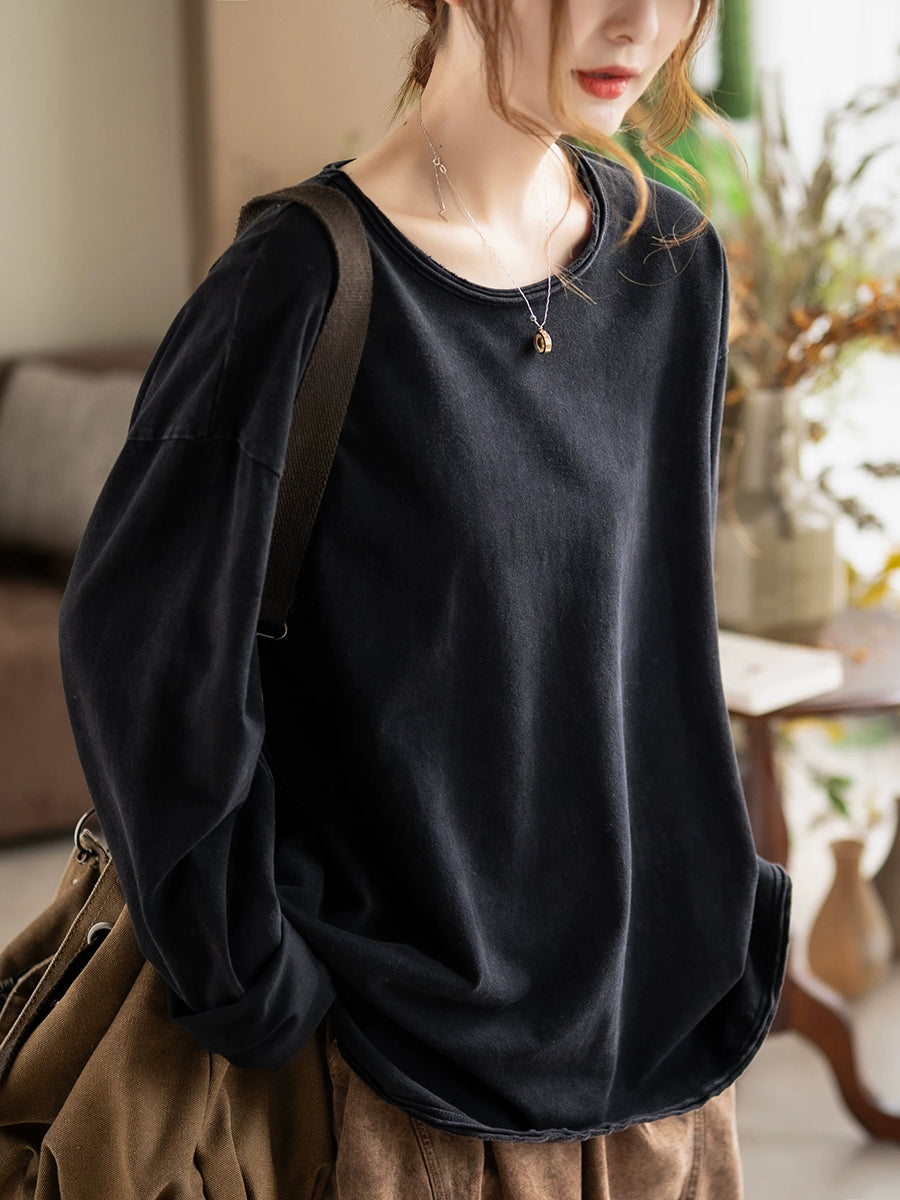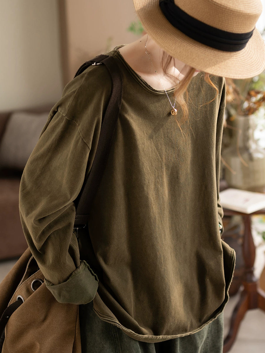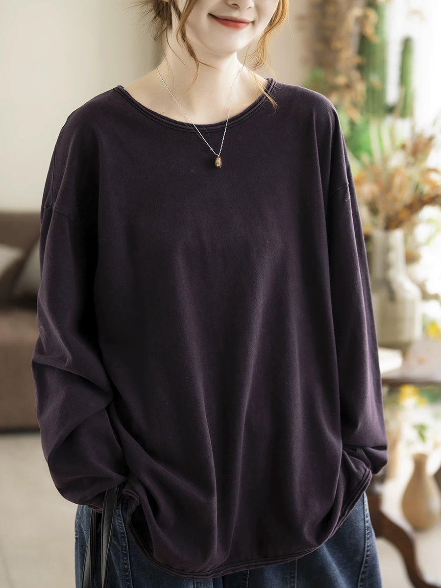 Women Spring Casual Pure Color 100%Cotton O-Neck Blouse
