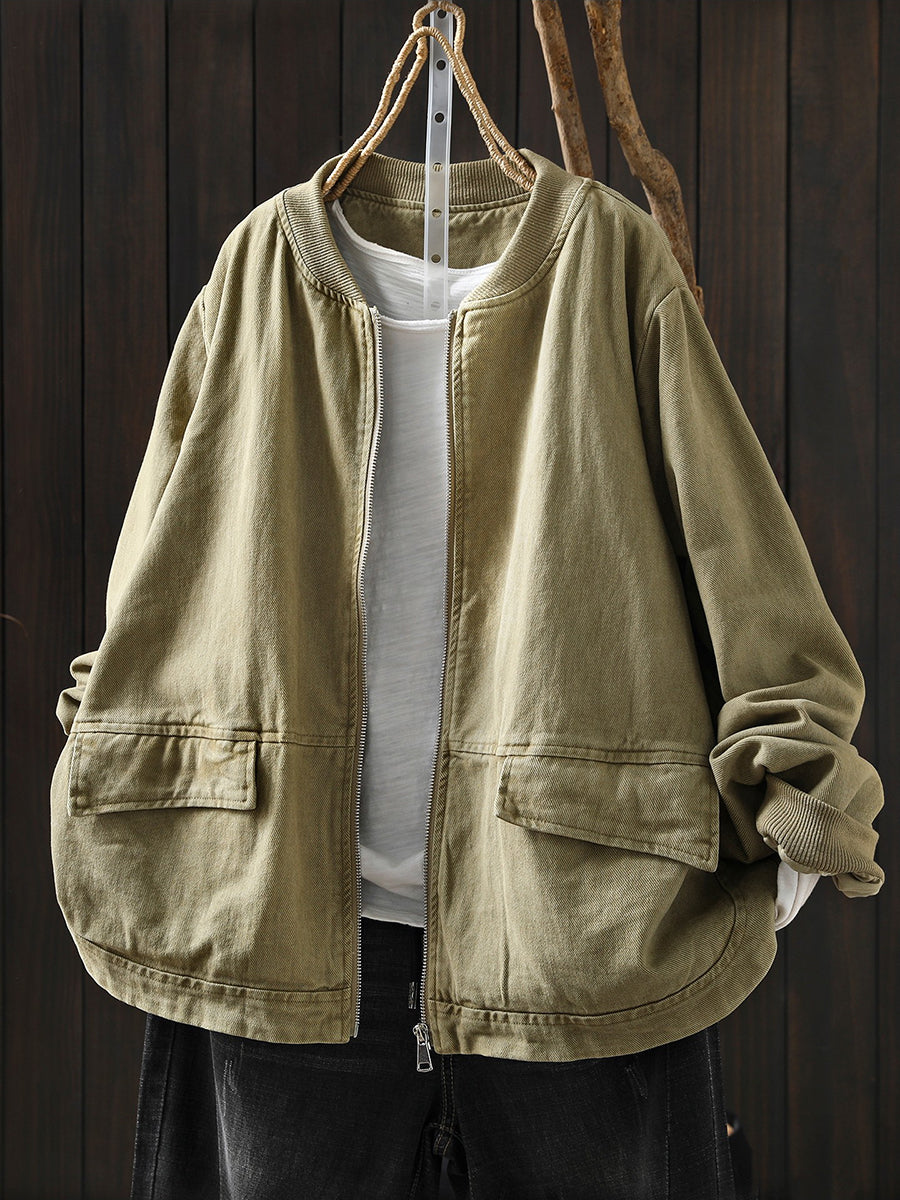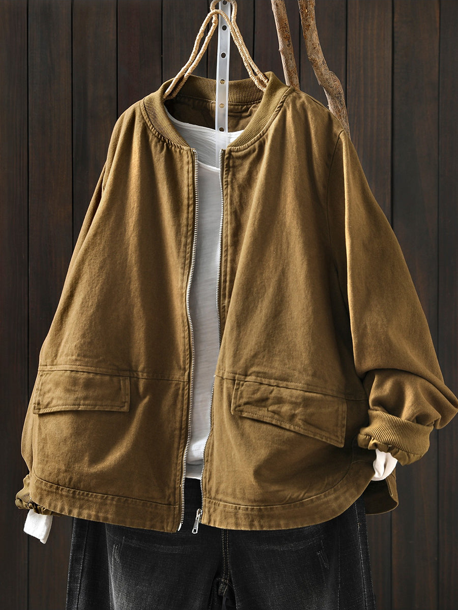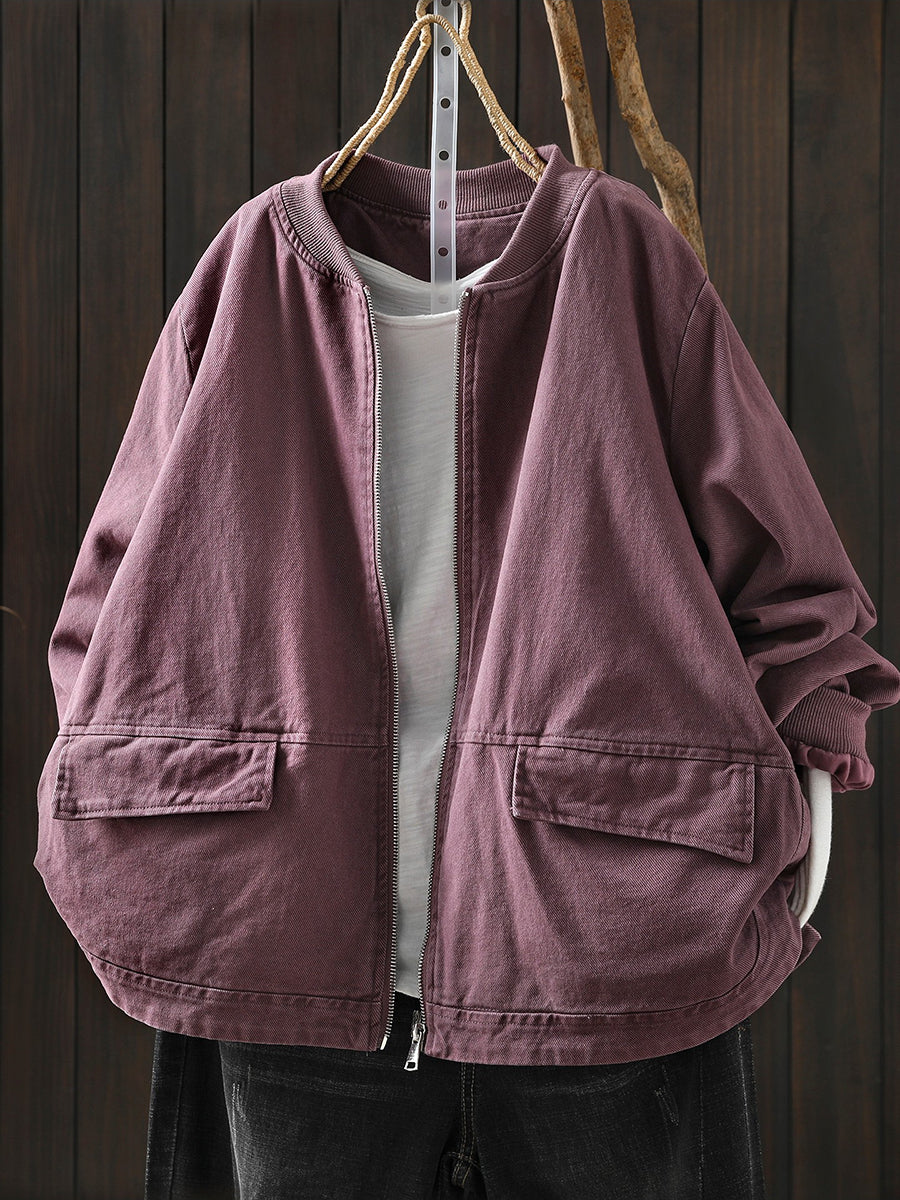 Women Spring Casual Pure Color Cotton Zipper Jacket