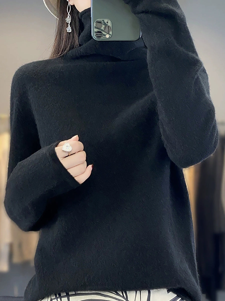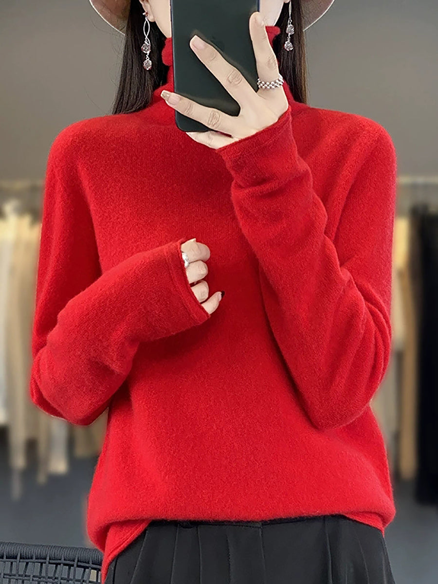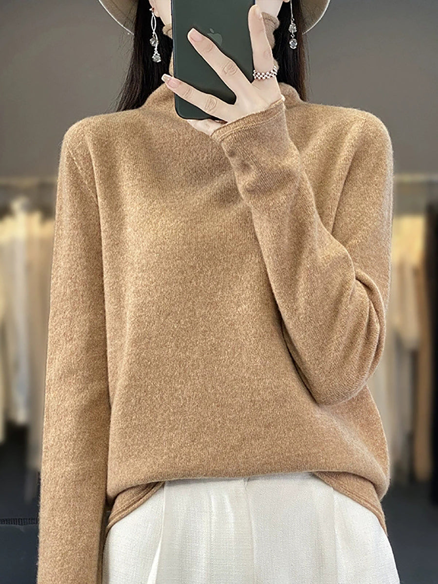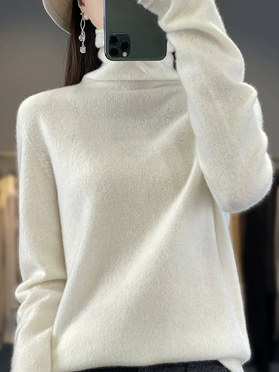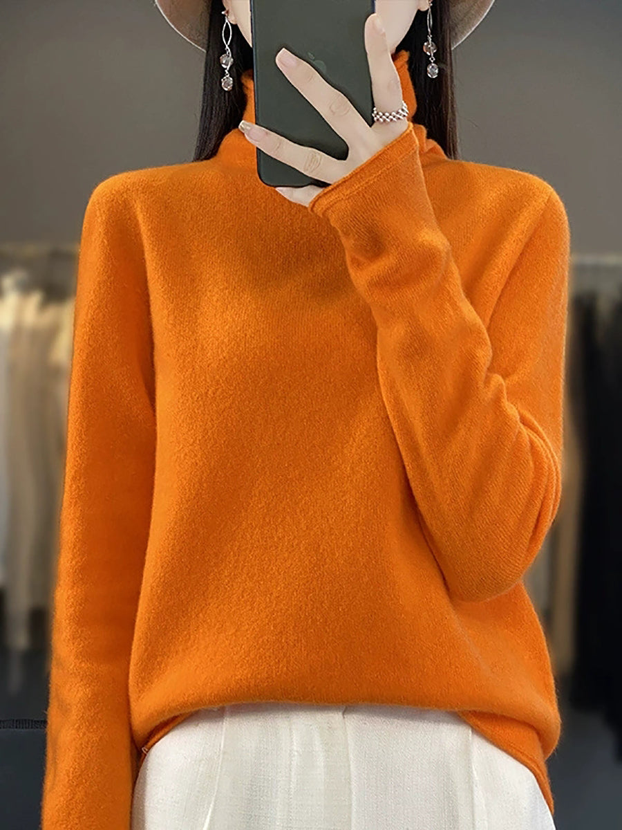 Women Spring Casual Pure Color Turtleneck Wool Sweater