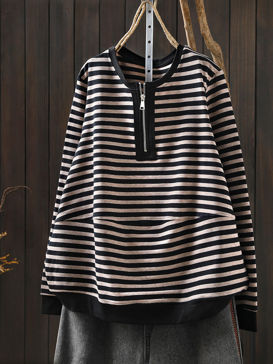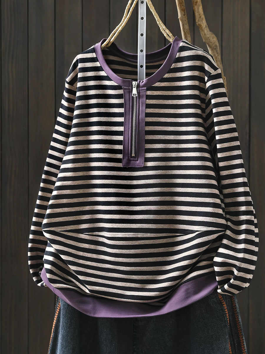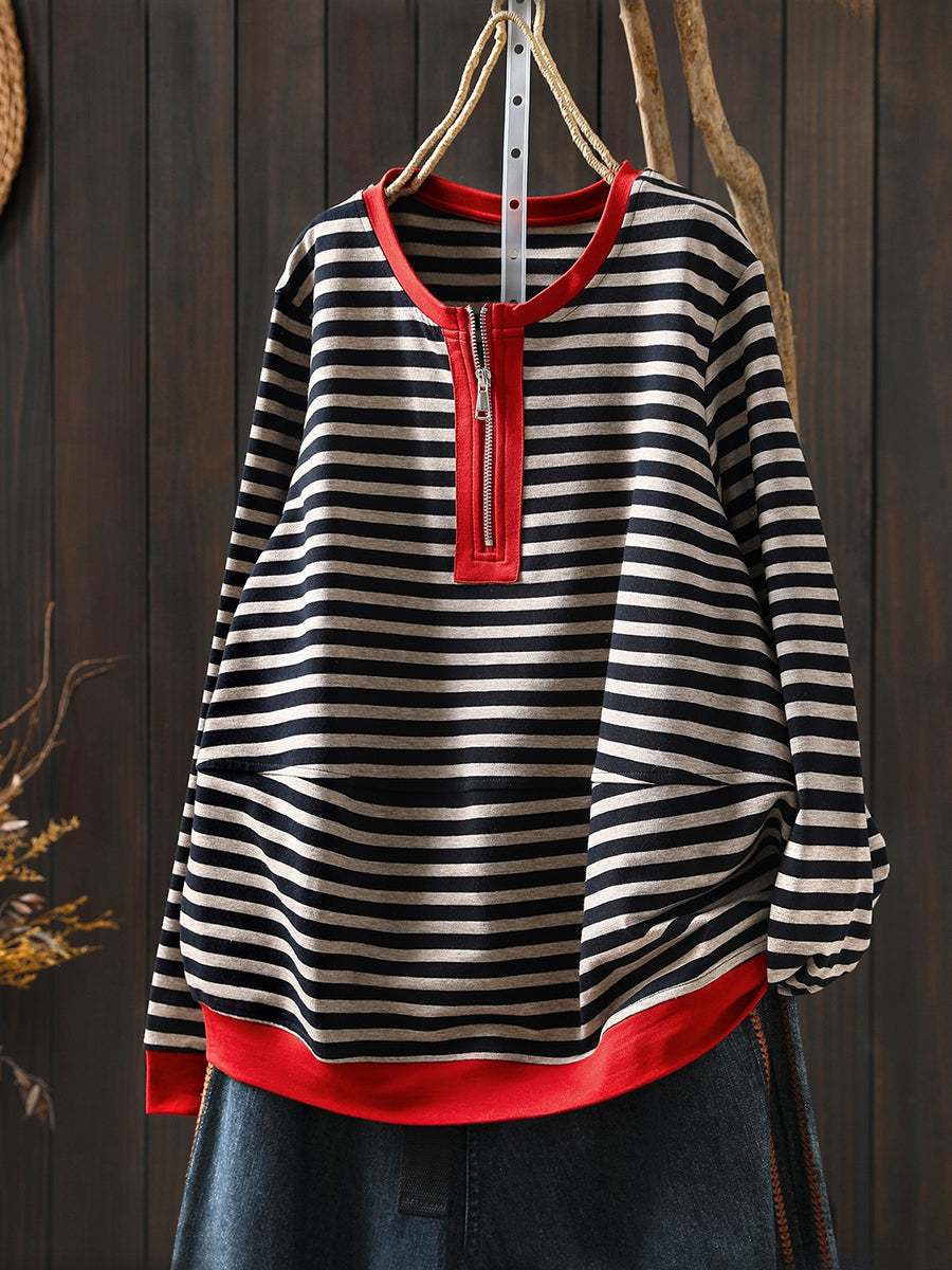 Women Spring Casual Stripe Cotton O-Neck Blouse