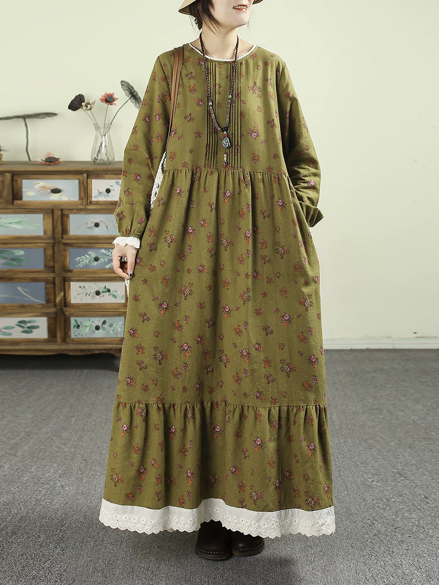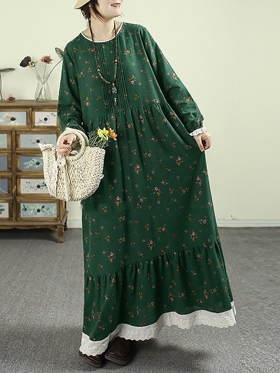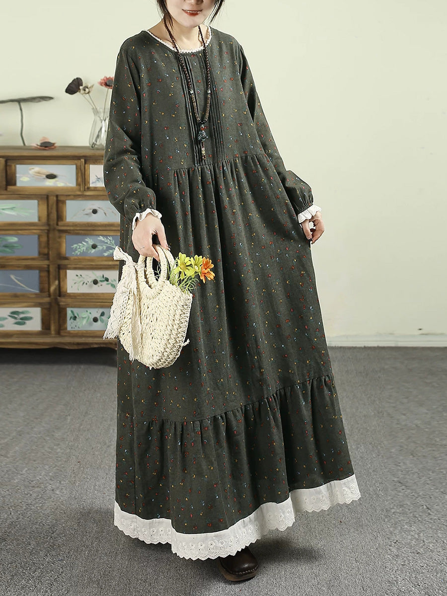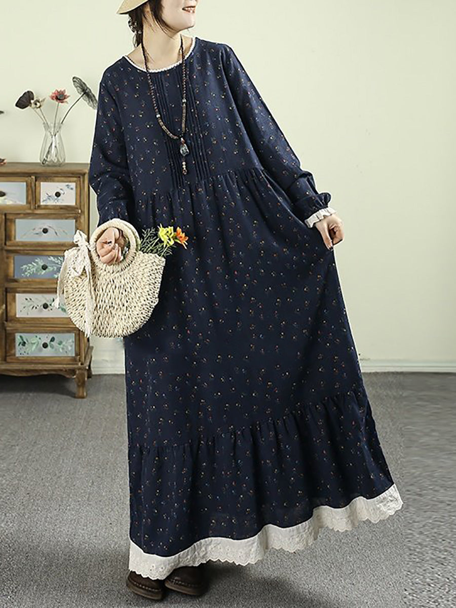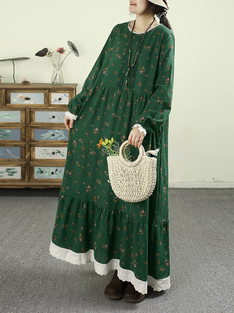 Women Spring Floral O-Neck Lace 100%Cotton Dress