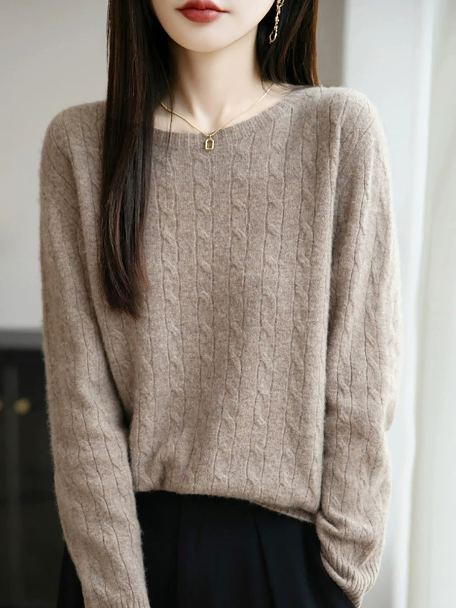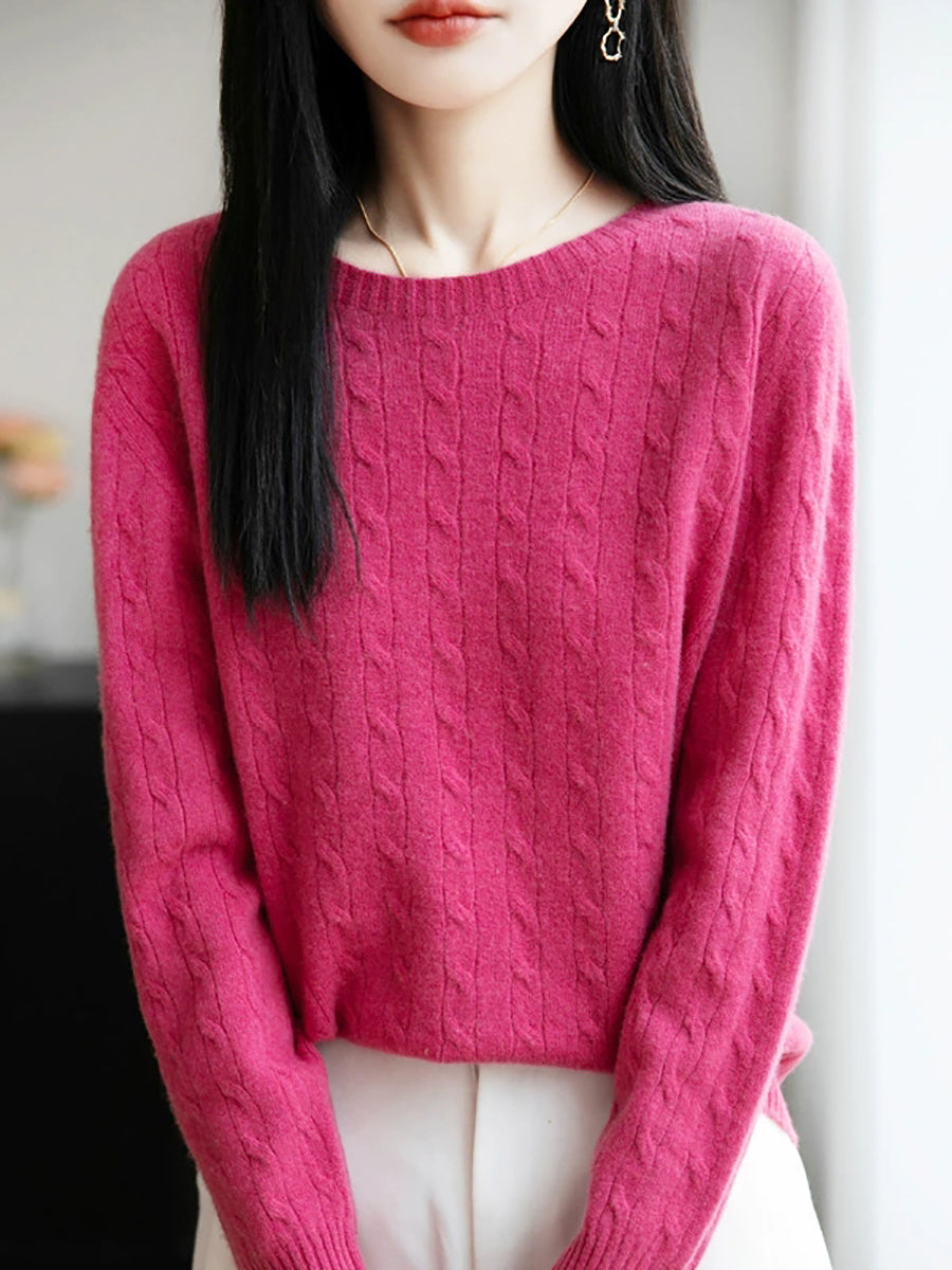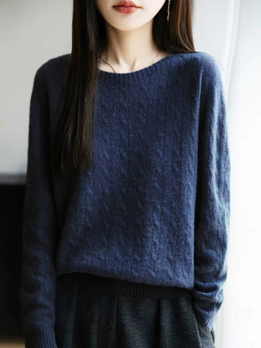 Women Spring Pure Color Cable-knit O-Neck Sweater