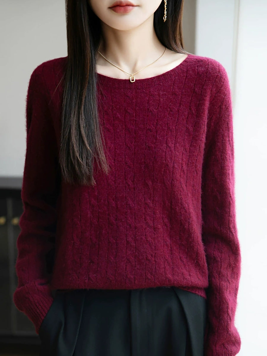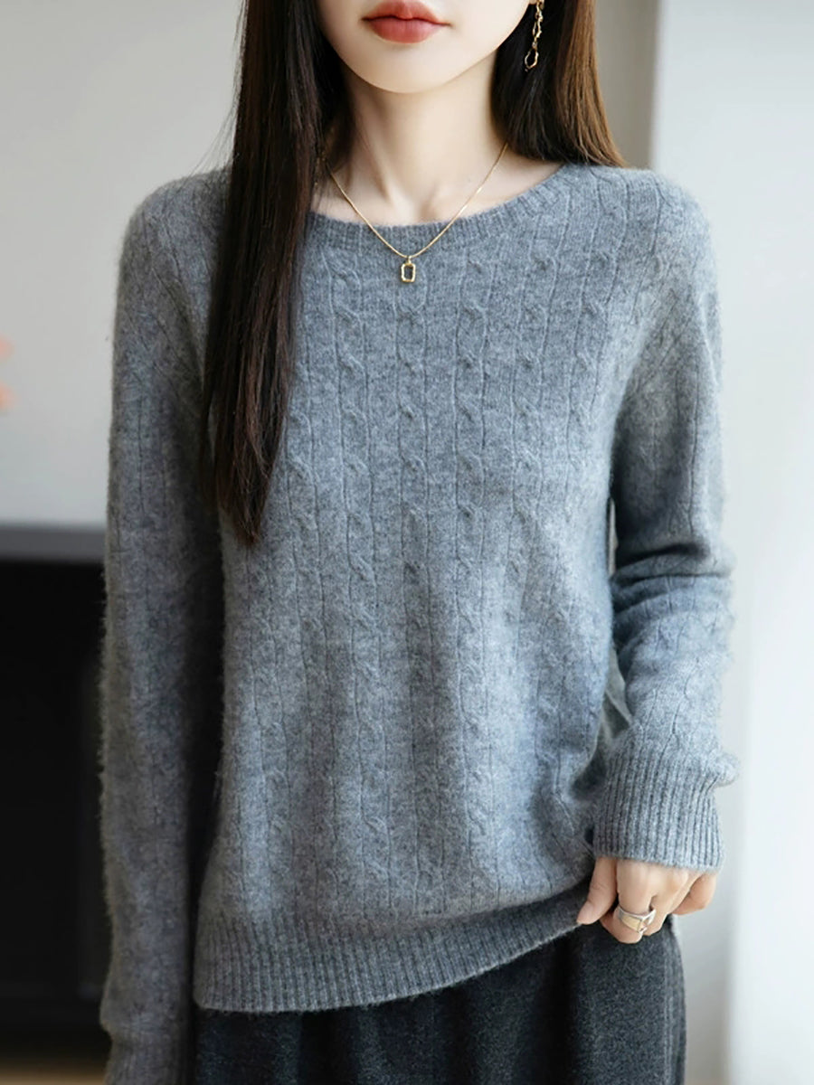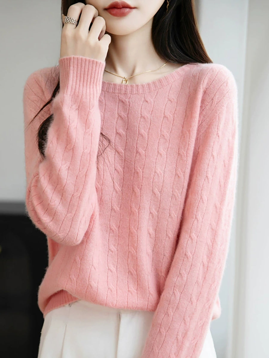 Women Spring Pure Color Cable-knit O-Neck Sweater