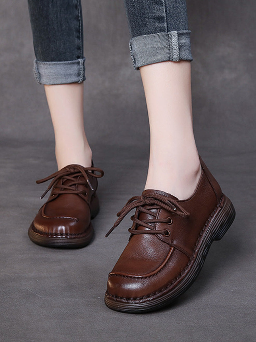 Women Spring Pure Color Genuine Leather Flat Shoes