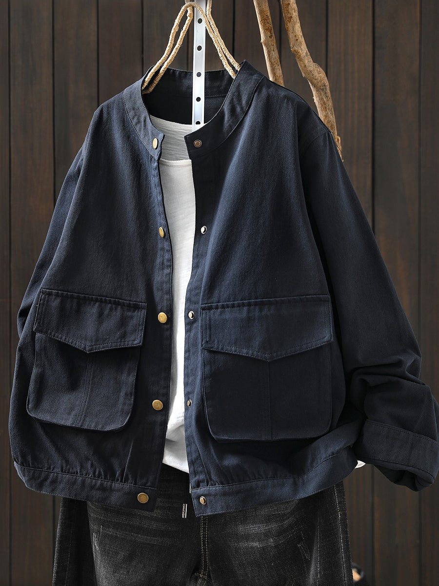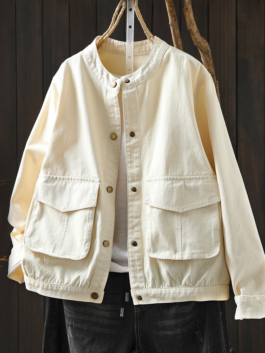Women Spring Pure Color Stand Collar 100%Cotton Coat