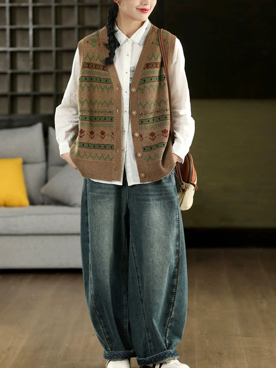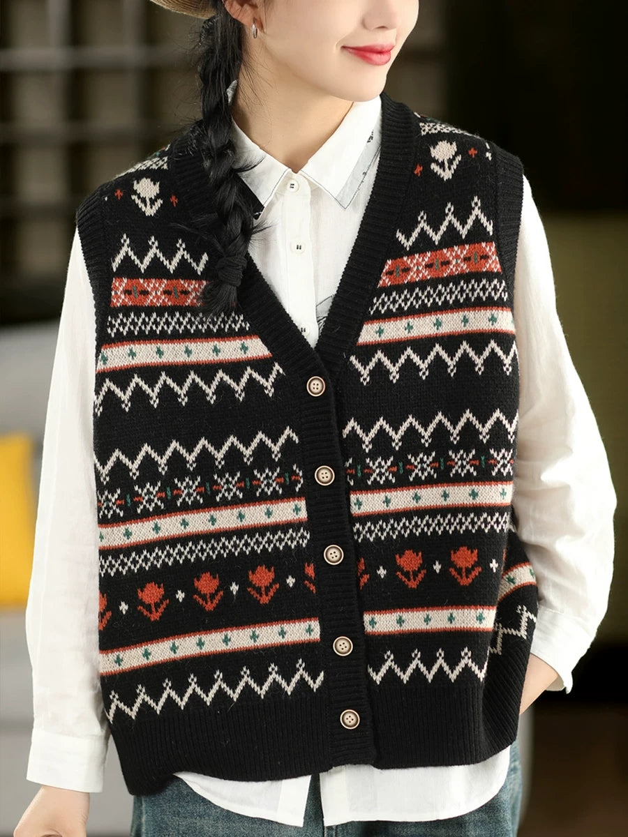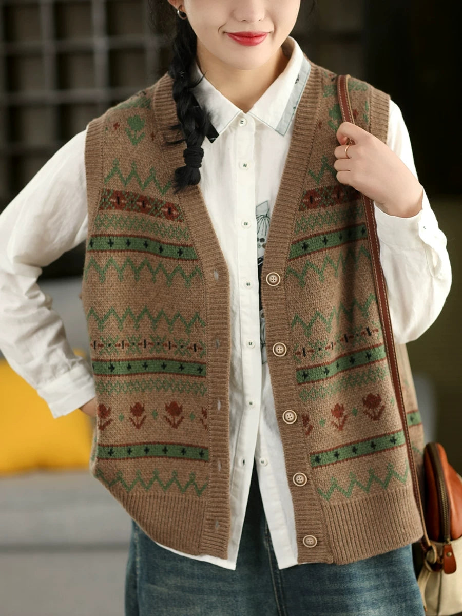 Women Spring Retro Jacquard V-Neck Vest