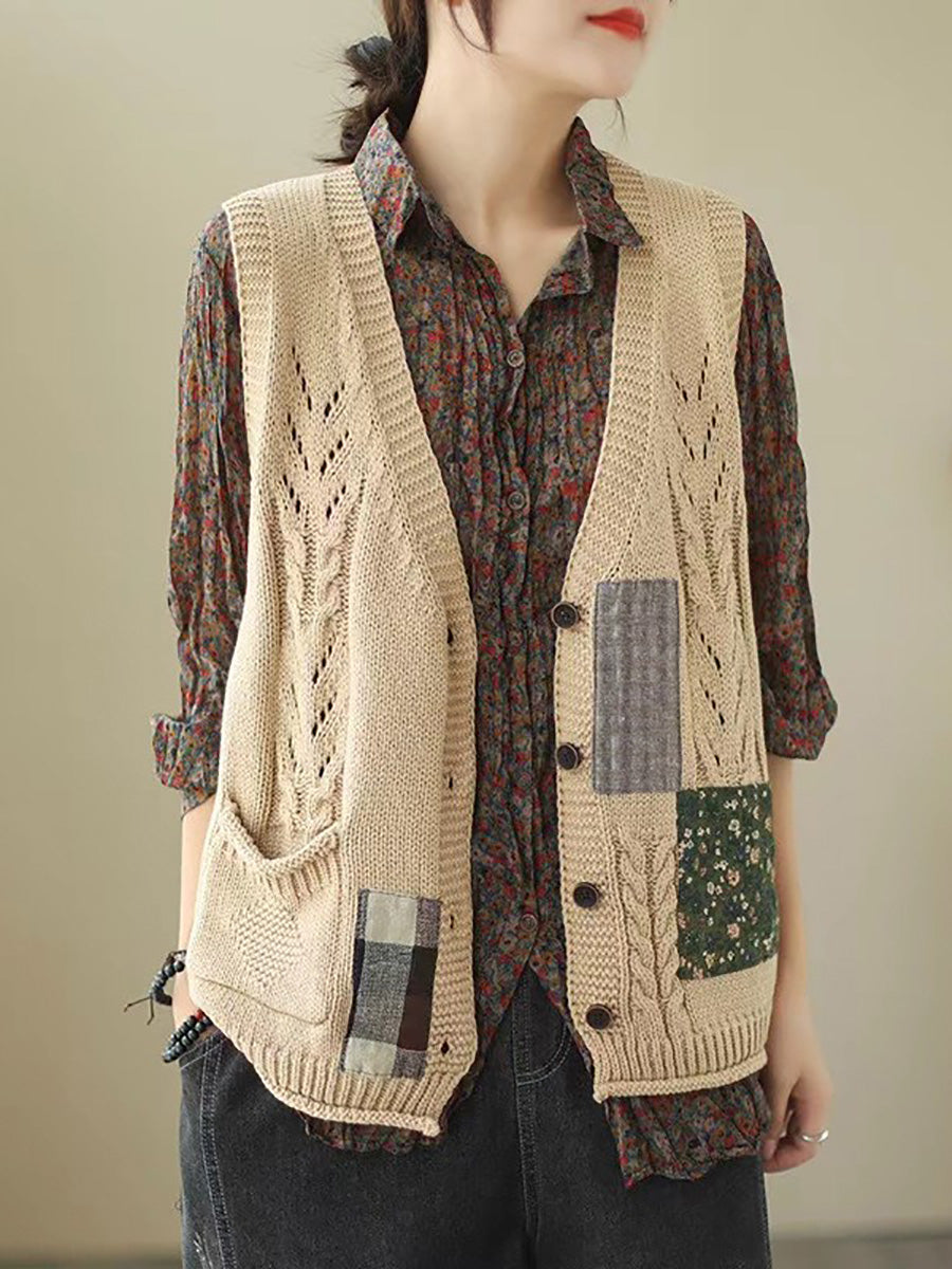 Women Spring Retro Patch Spliced Knitted Vest