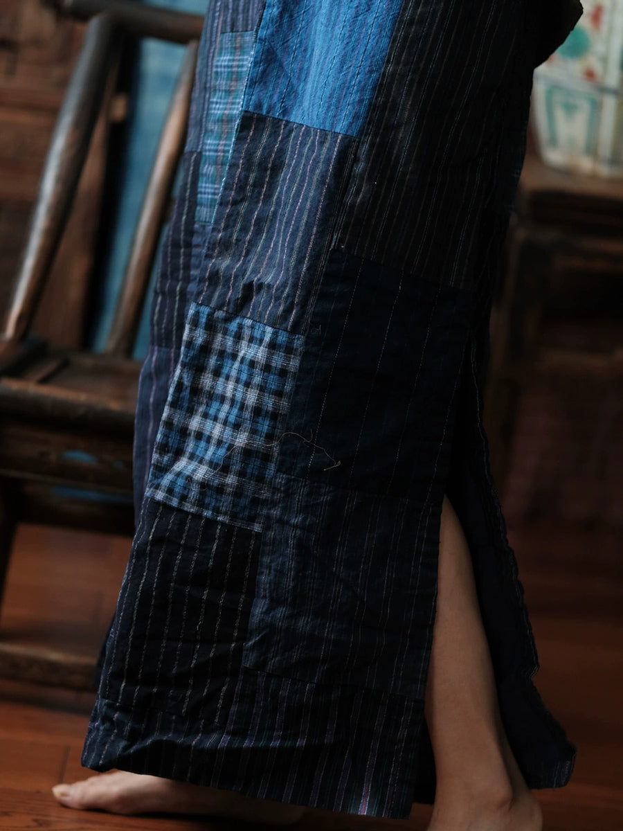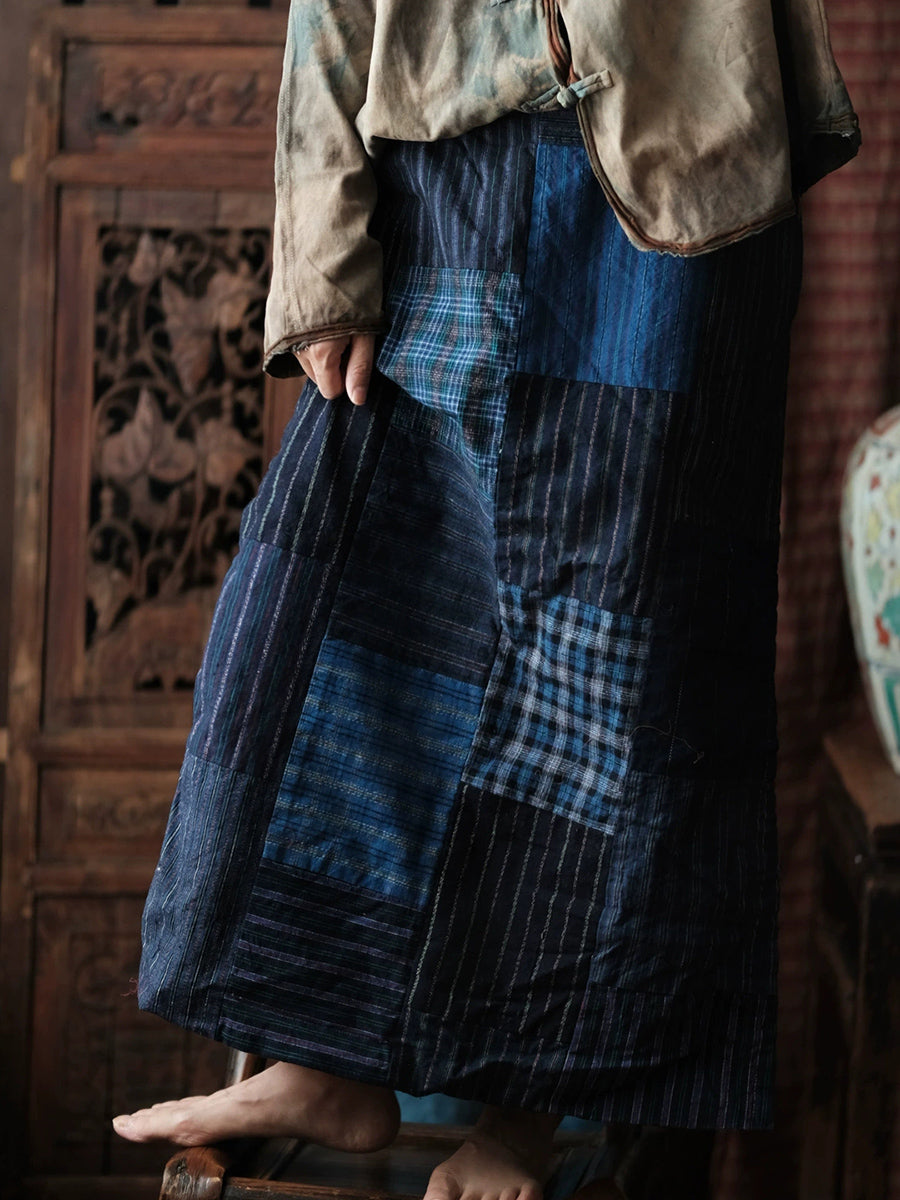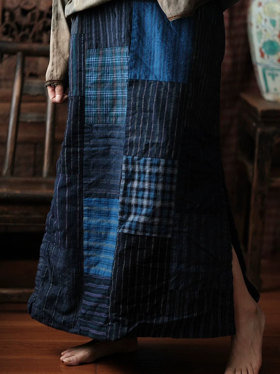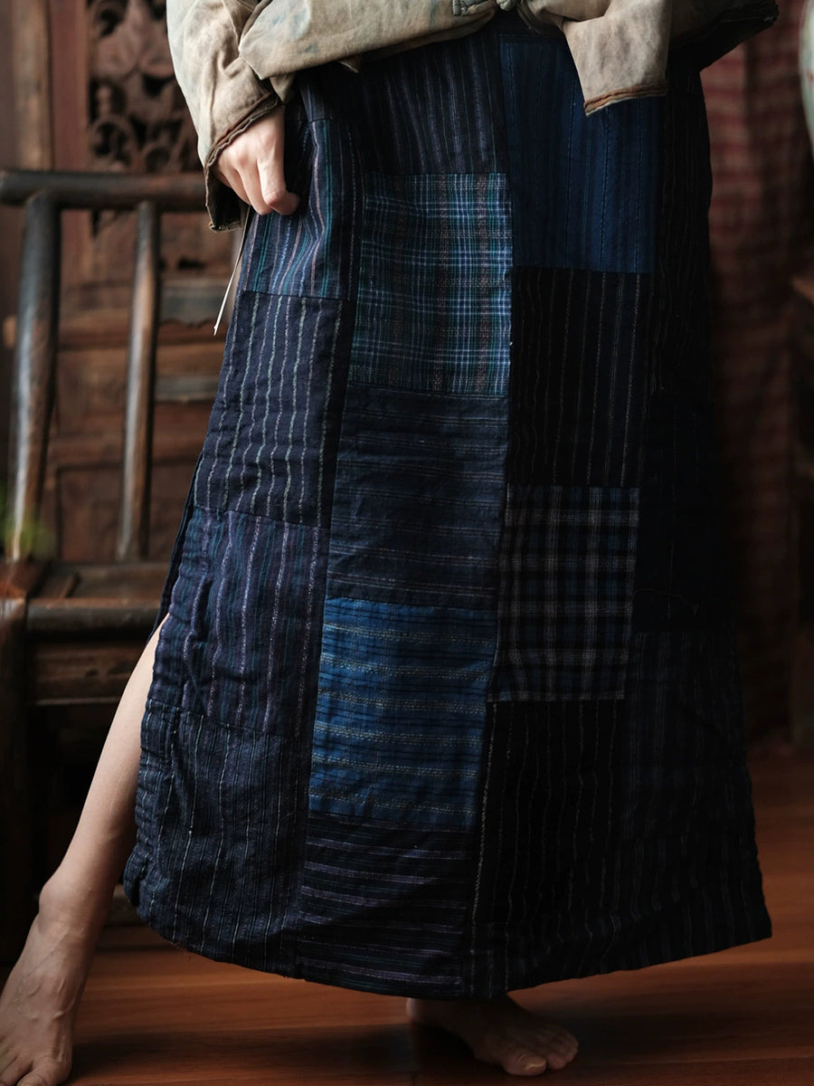 Women Spring Retro Patchwork Cotton Split Hem Skirt