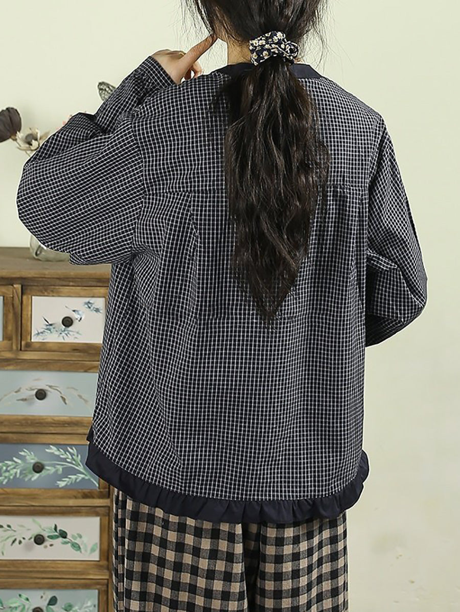 Women Spring Retro Plaid 100%Cotton Stand Collar Shirt