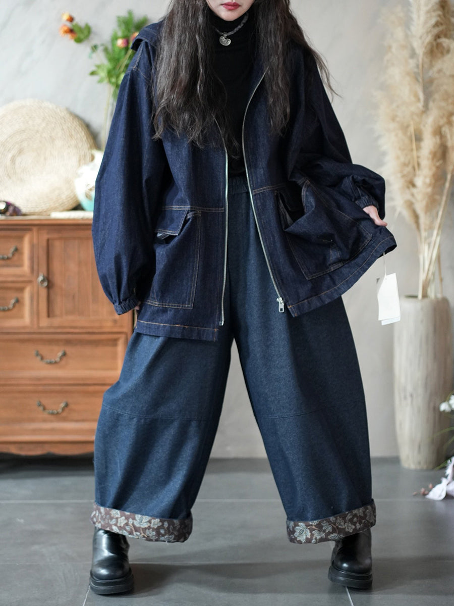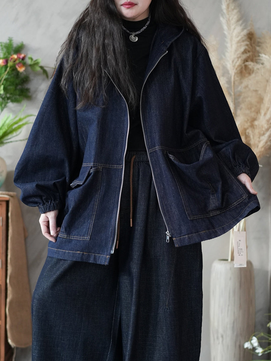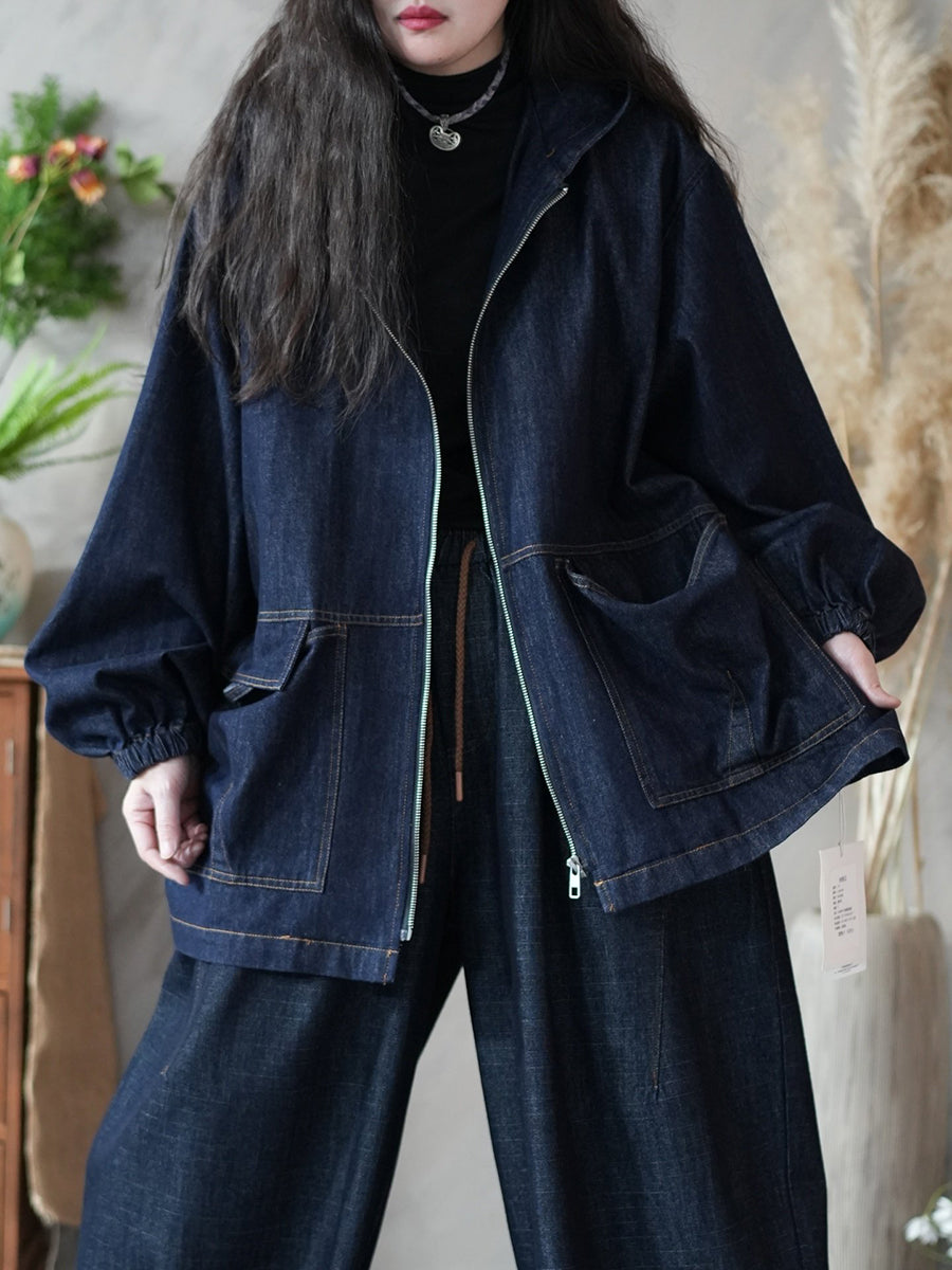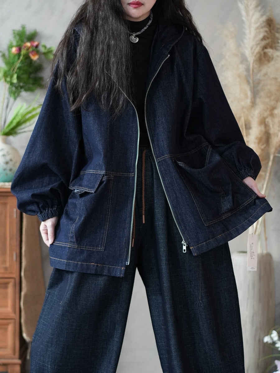 Women Spring Retro Pure Color Denim Hooded Coat