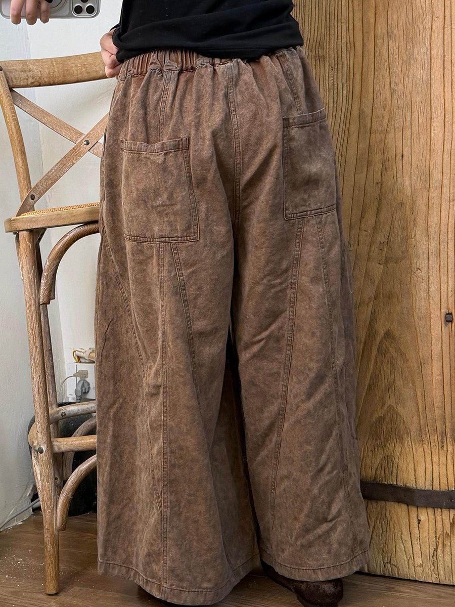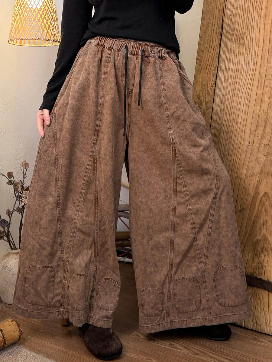 Women Spring Retro Pure Color Denim Wide-leg Pants