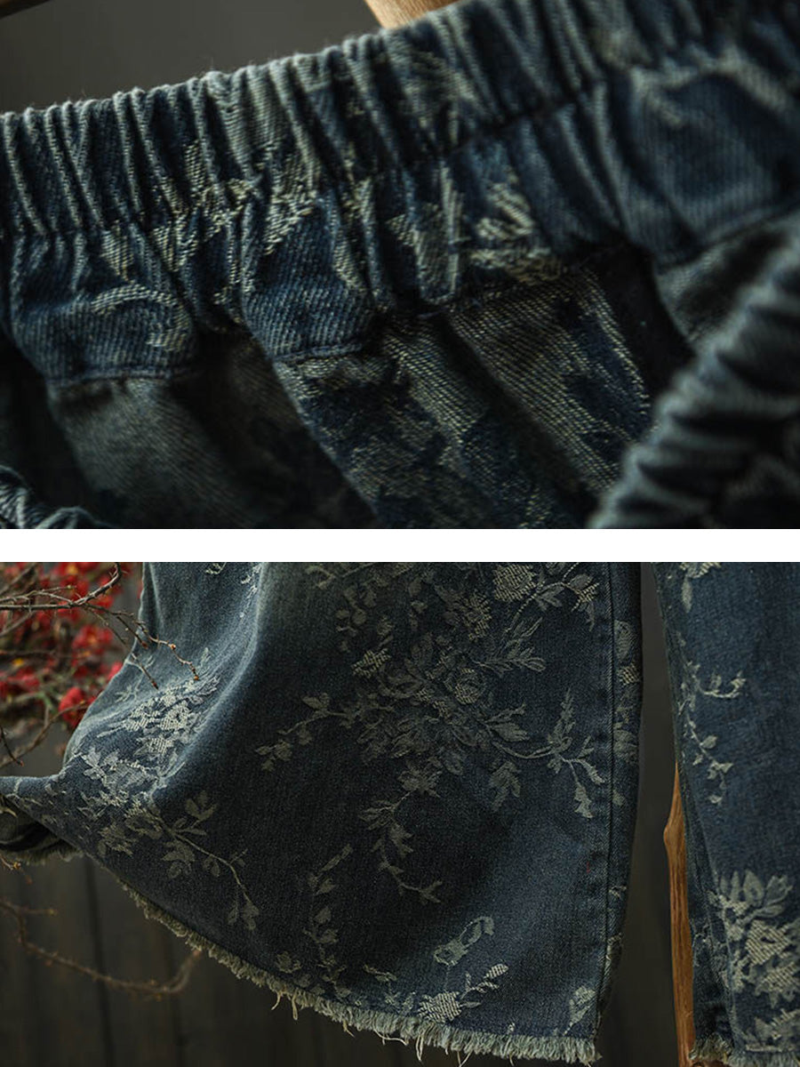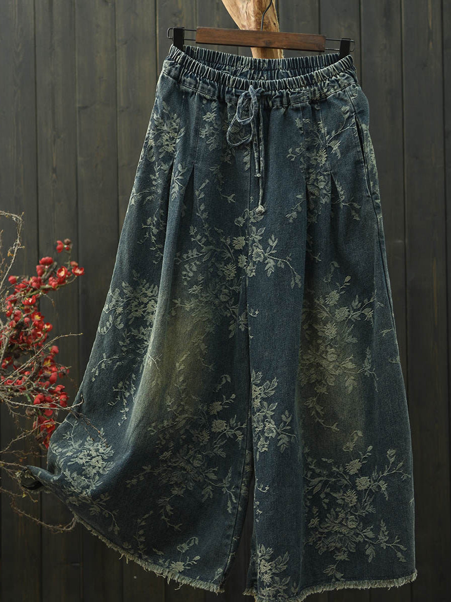 Women Spring Vintage Flower Denim Wide-leg Pants