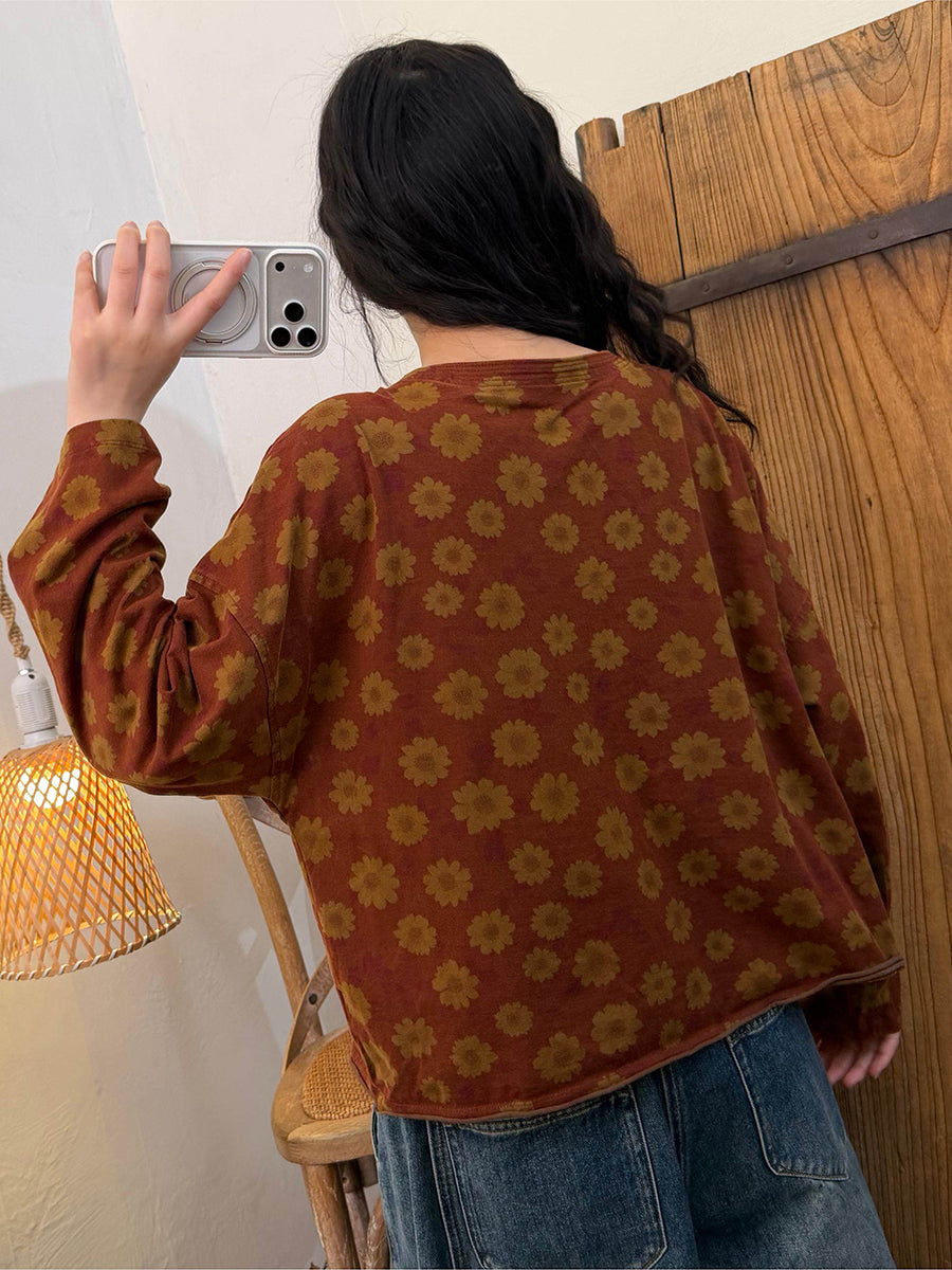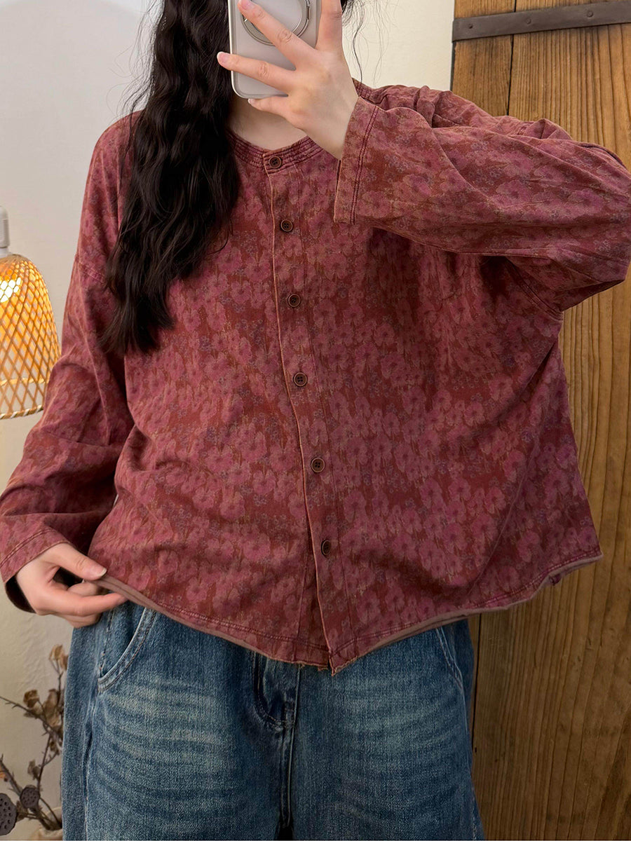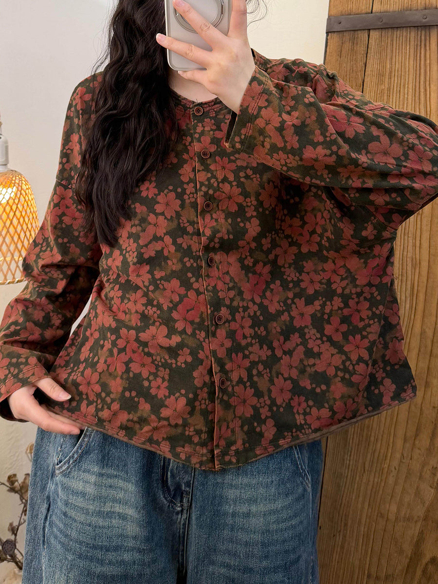 Women Spring Vintage Flower O-Neck Shirt