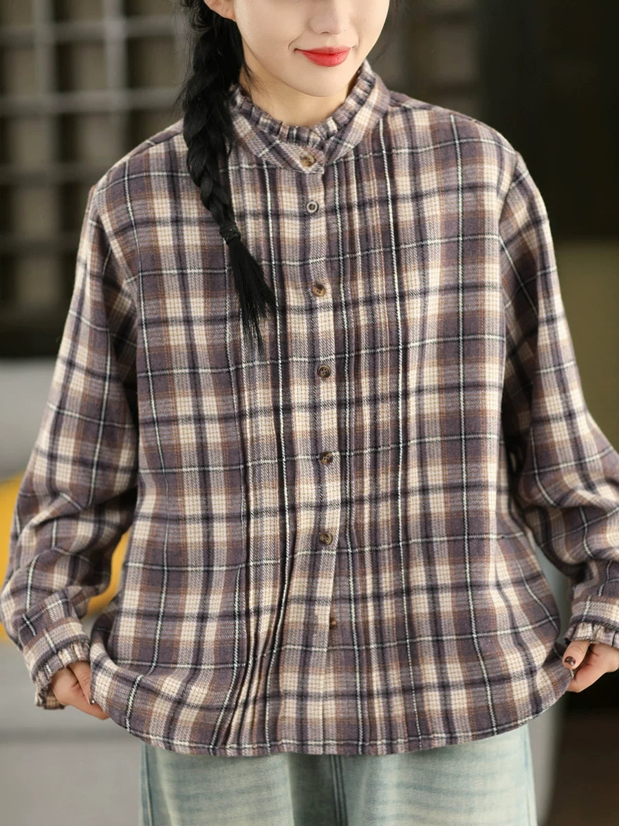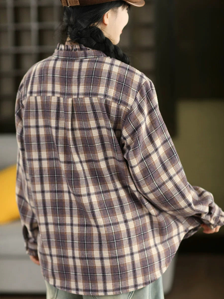 Women Spring Vintage Plaid Turn-down Collar Shirt