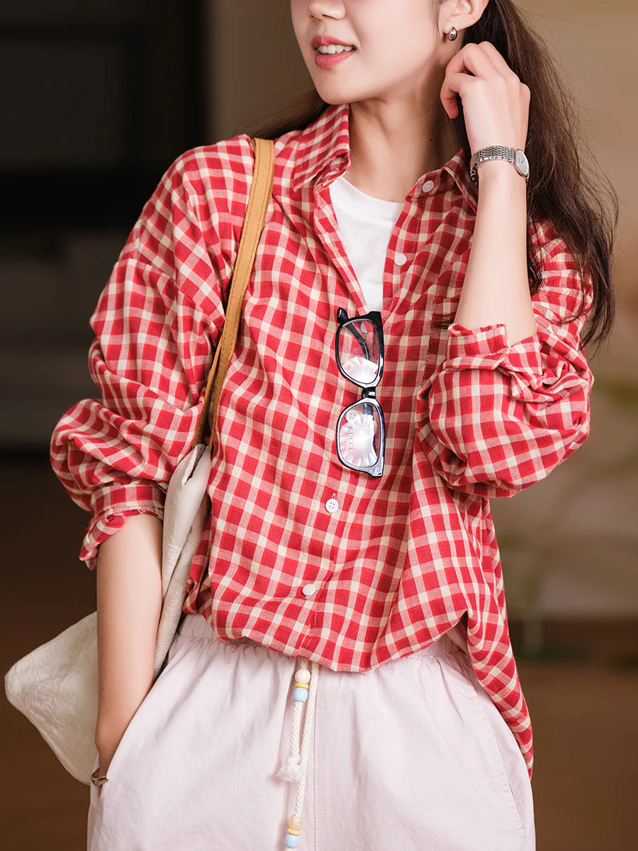 Women Summer Artsy Plaid Turn-down Collar Blouse