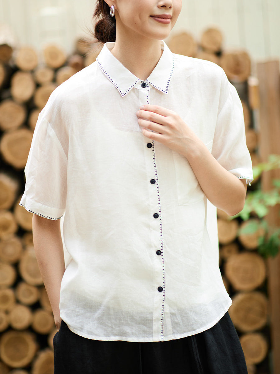 Plus Size Women Summer Artsy Ramie Turn-down Collar Shirt