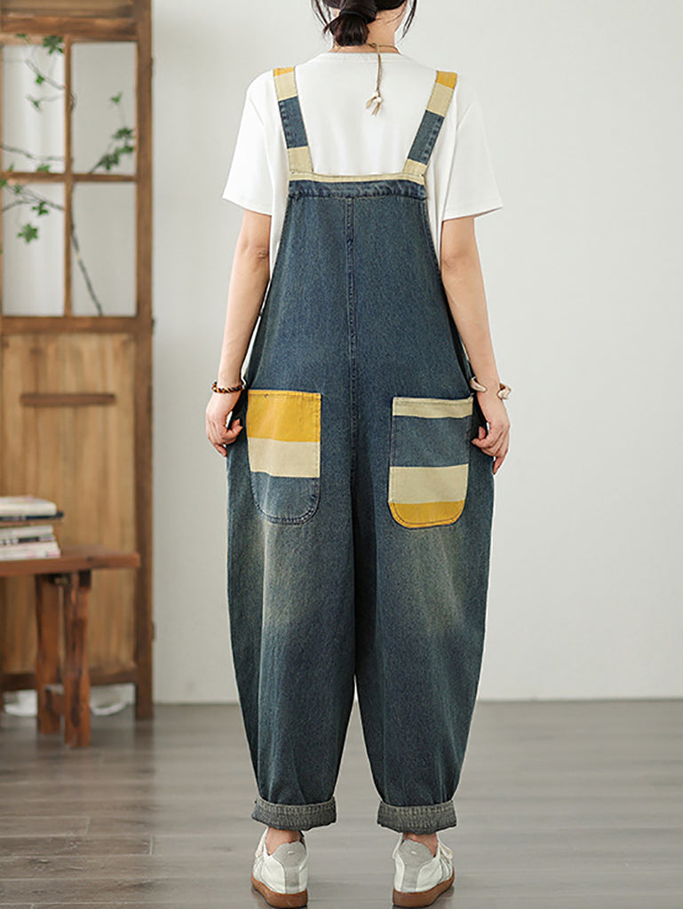 Women Summer Colorblock Stripe Denim Loose Jumpsuits