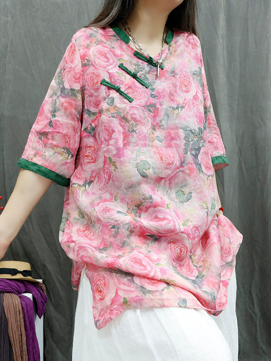 Women Summer Ethnic Flower 100%Ramie Blouse