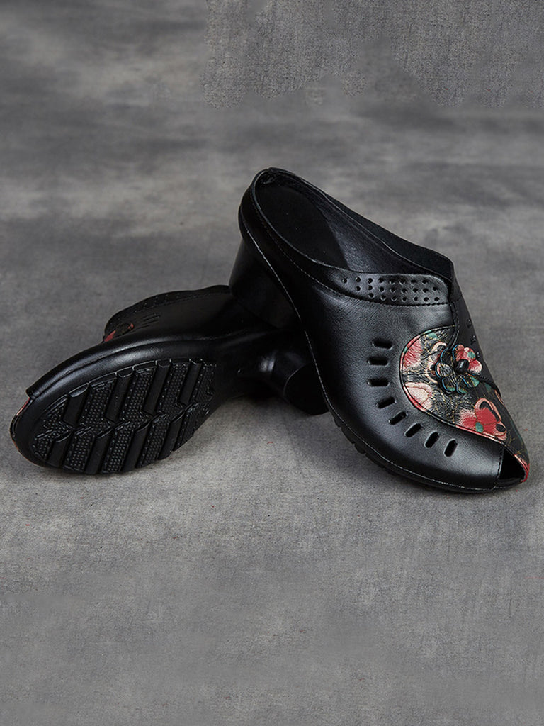 Women Summer Ethnic Flower Leather Spliced Mid Heel Slippers