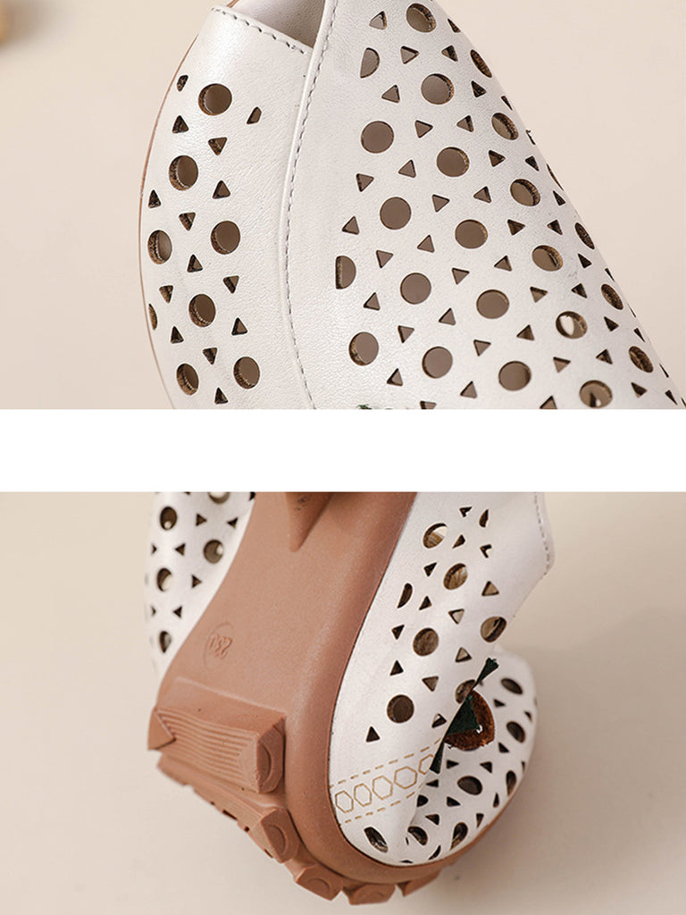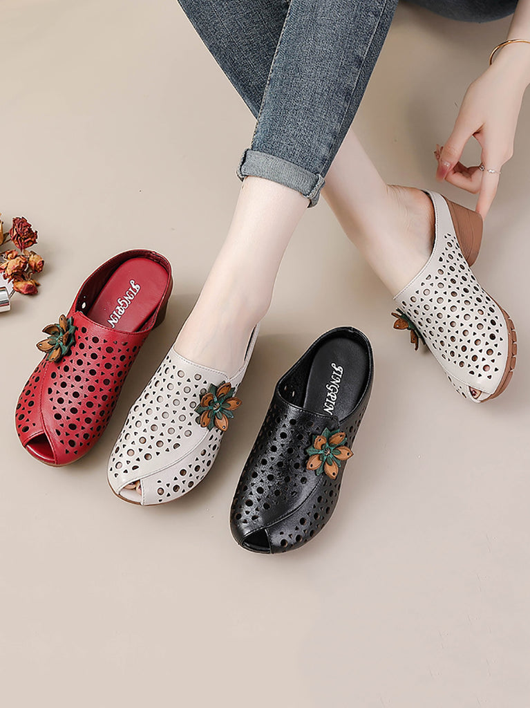 Women Summer Genuine Leather Flower Mid Heel Slippers
