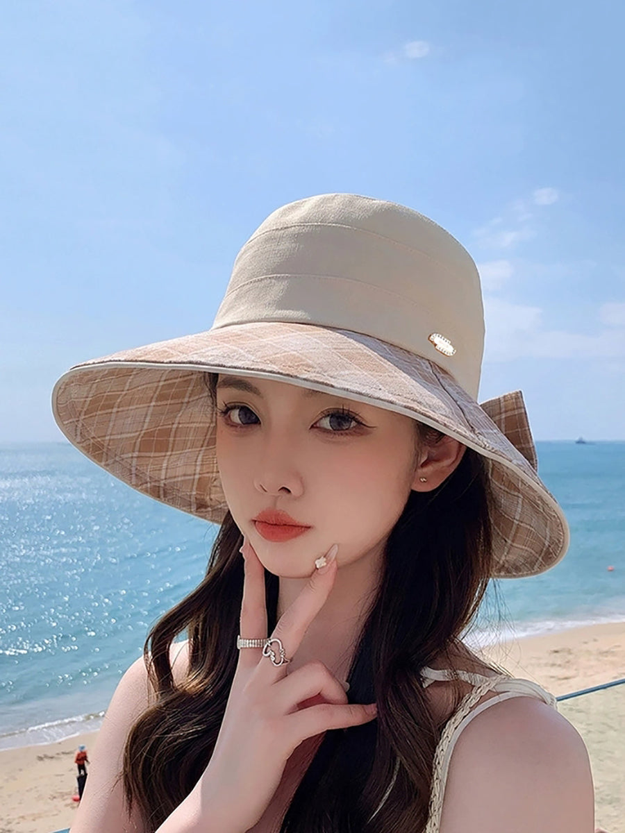 Women Summer Plaid Spliced Bowknot Sunproof Hat