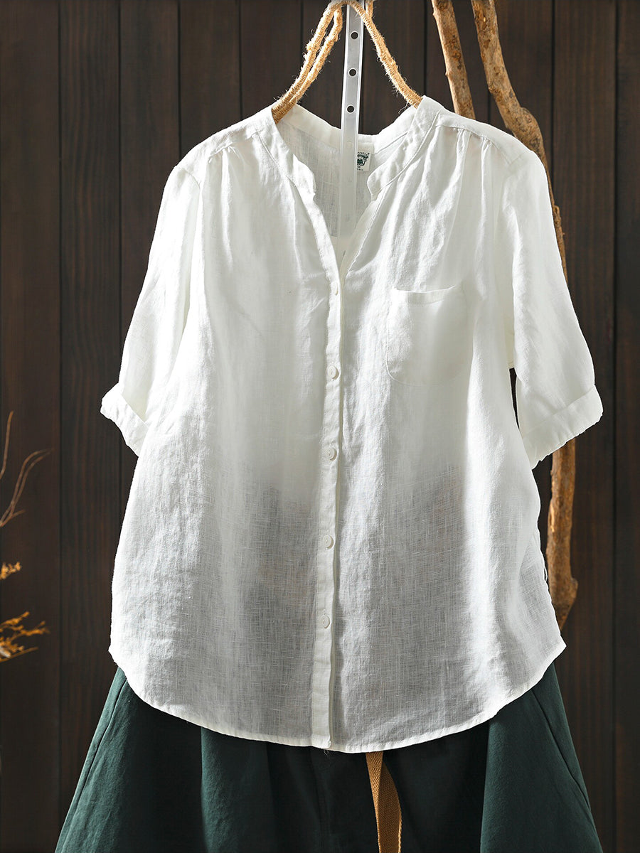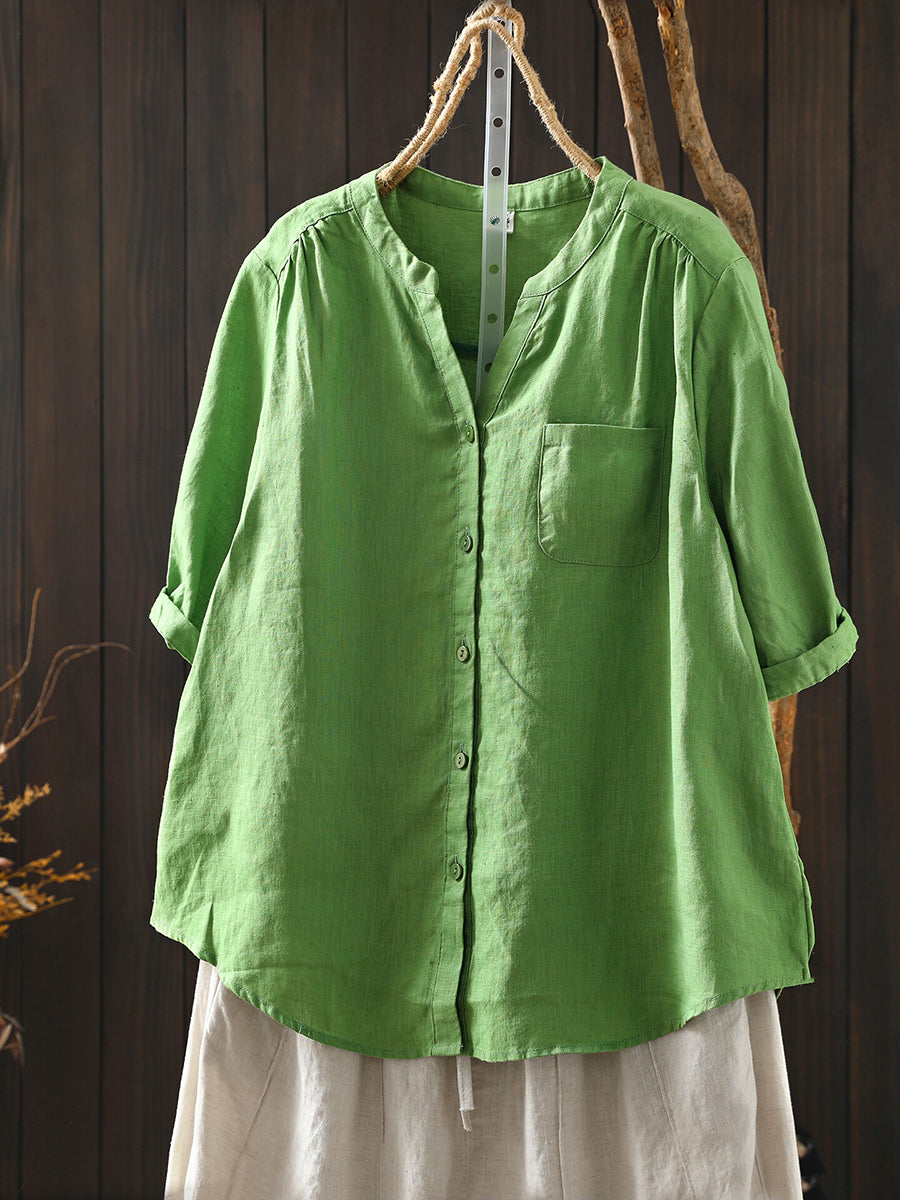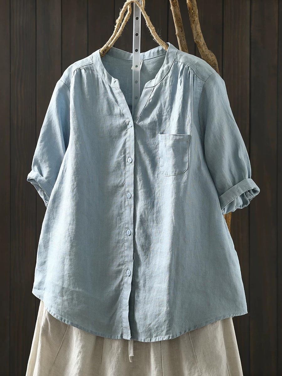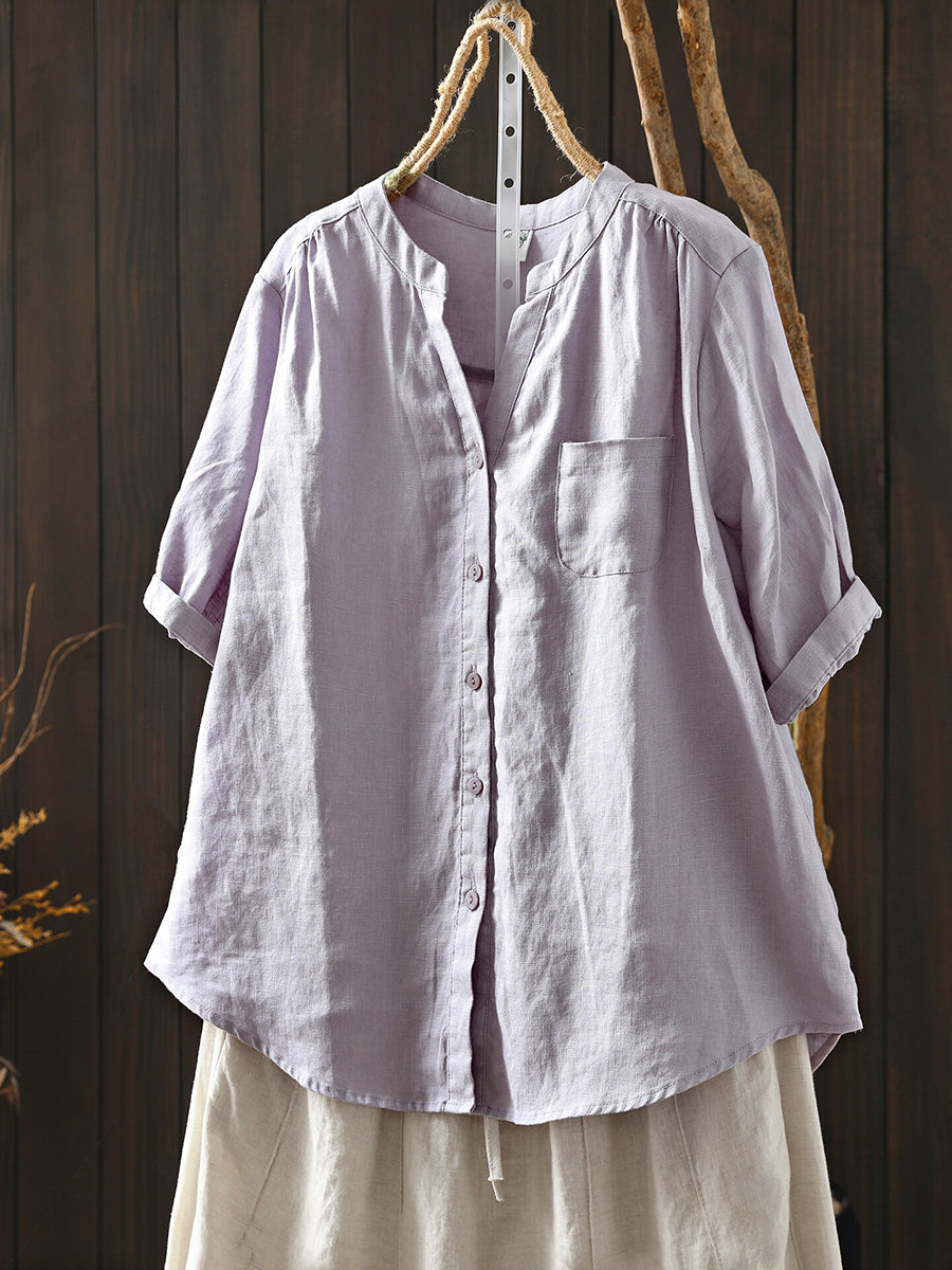 Women Summer Retro Pure Color 100%Linen Blouse