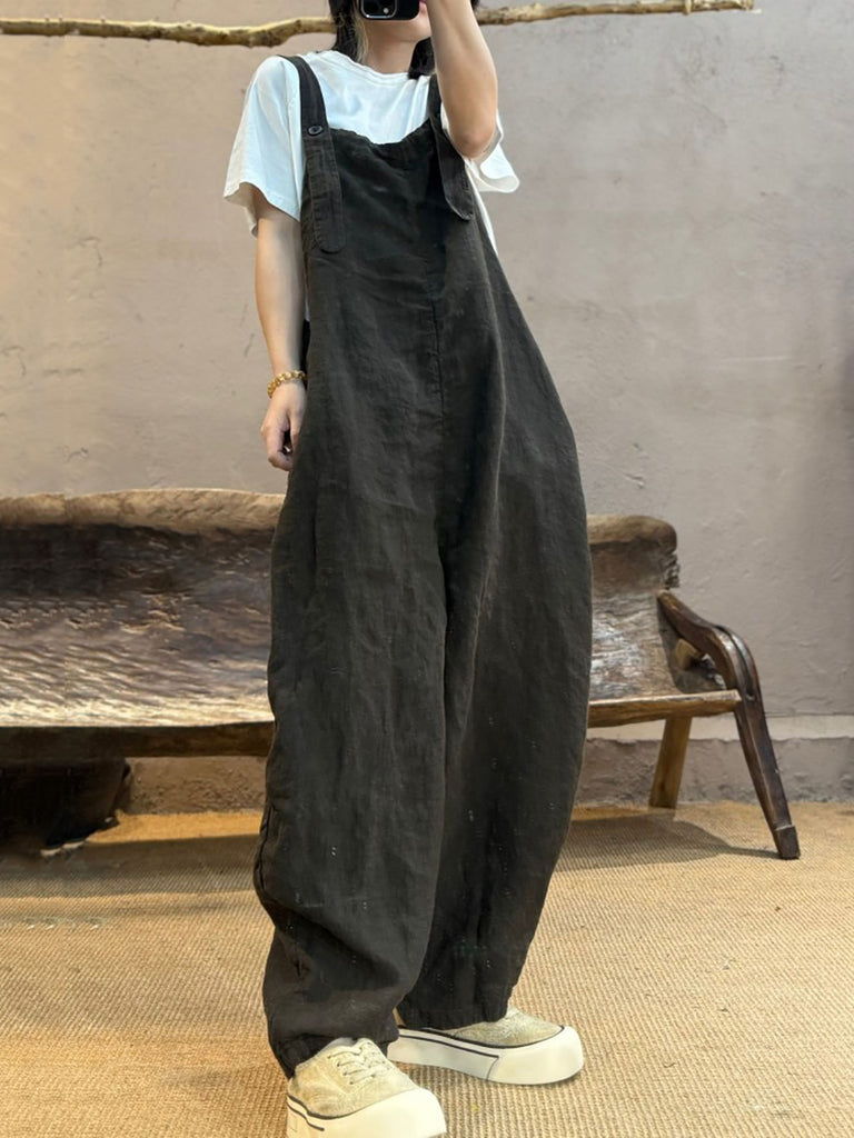 Plus Size Women Summer Retro Pure Color Linen Loose Jumpsuits