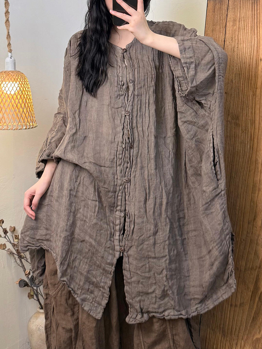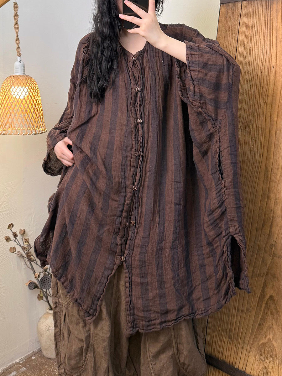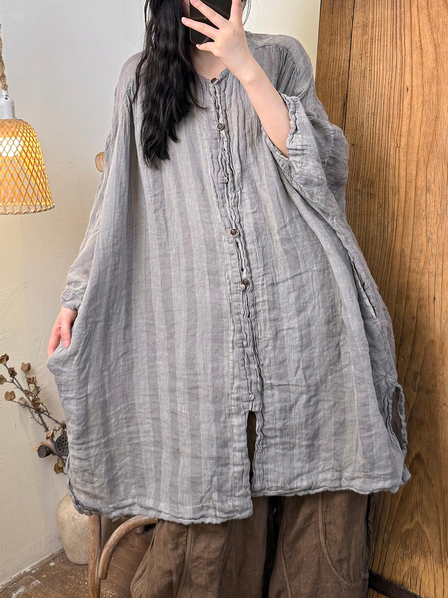 Women Summer Retro Stripe O-Neck Linen Shirt