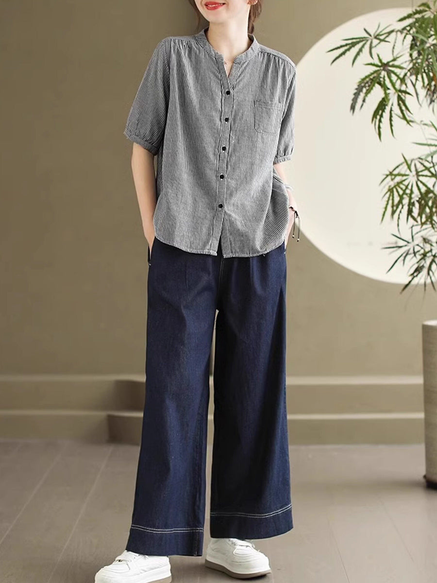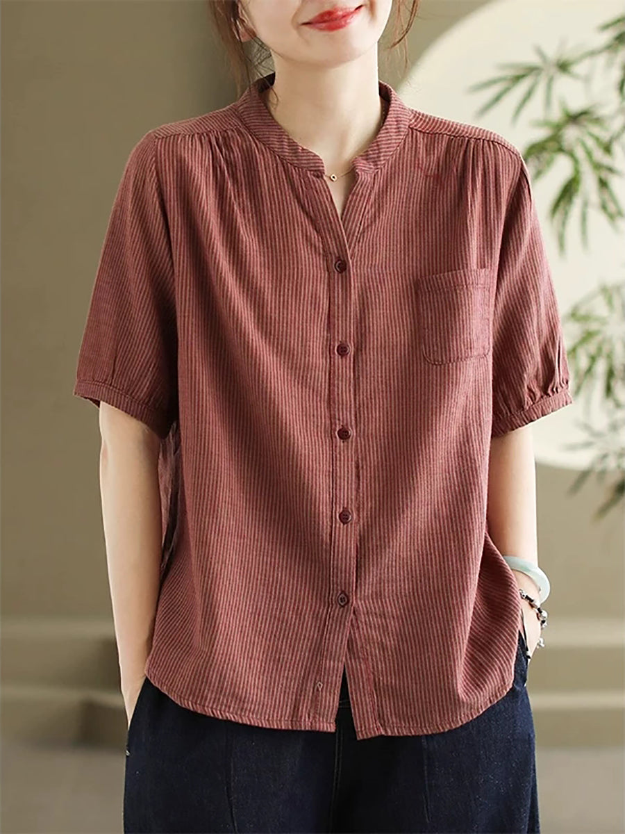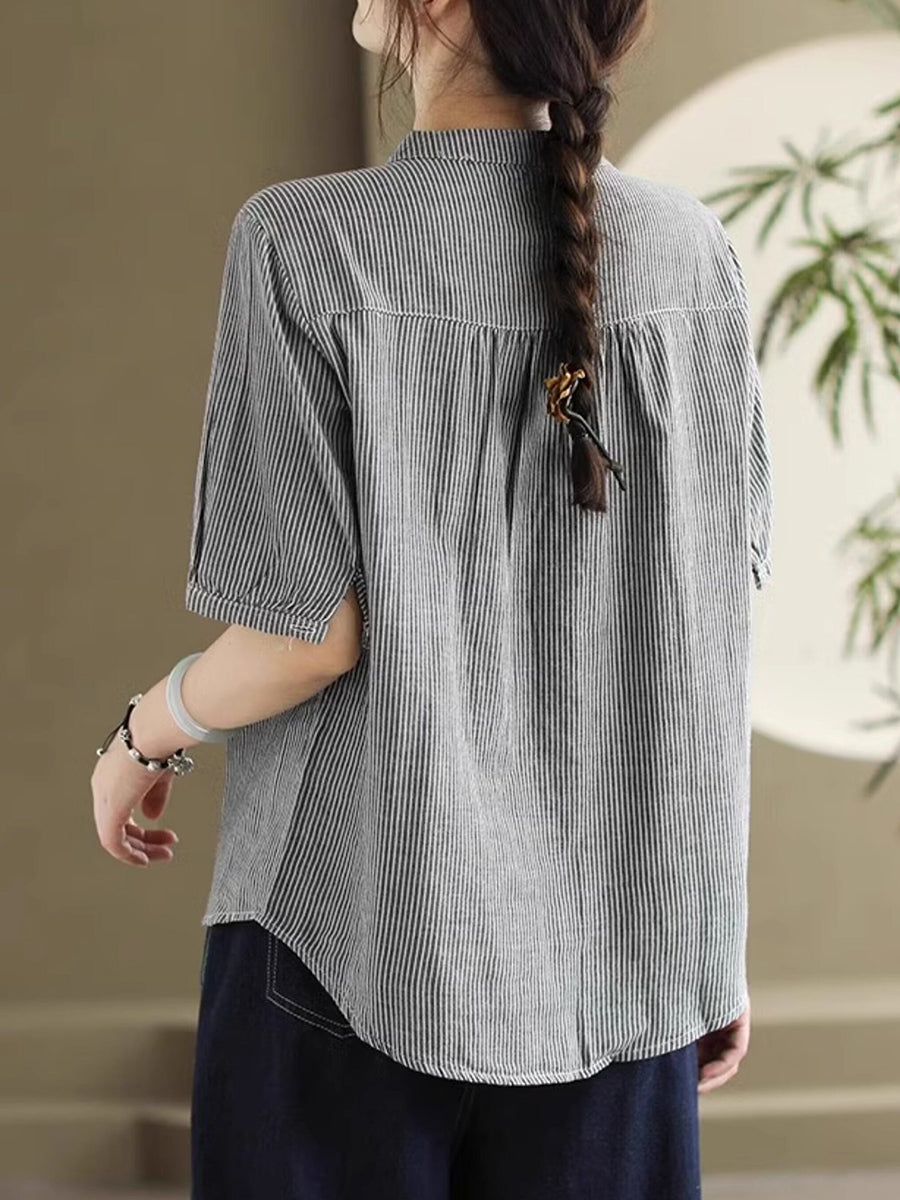 Women Summer Retro Stripe V-Neck 100%Cotton Shirt