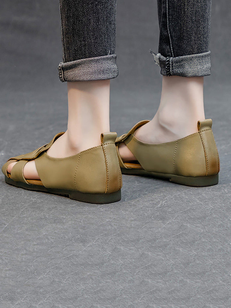 Women Summer Solid Vintage Leather Hollow Out Soft Shoes