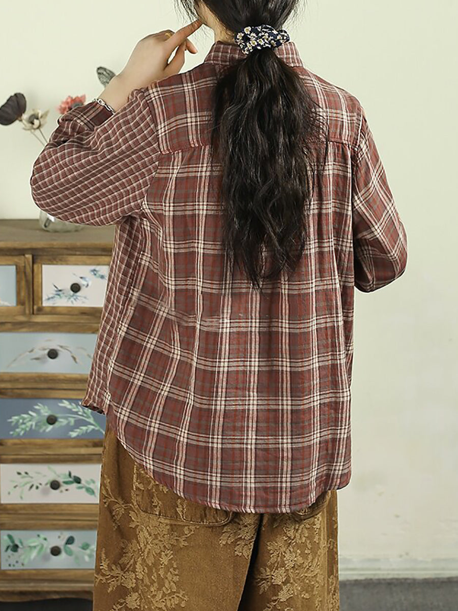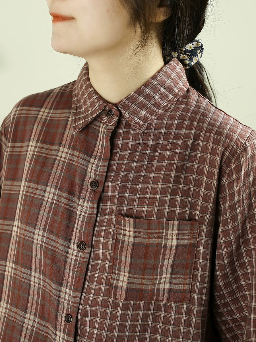 Women Vintage Spring Plaid Turn-down Collar 100%Cotton Shirt