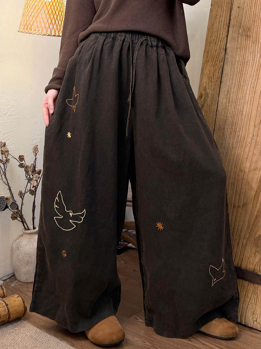 Women Winter Artsy Bird Embroidery Wide-leg Pants