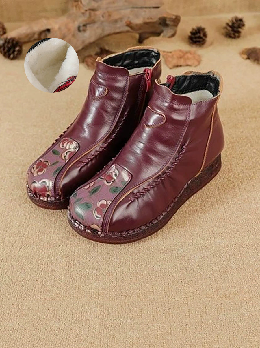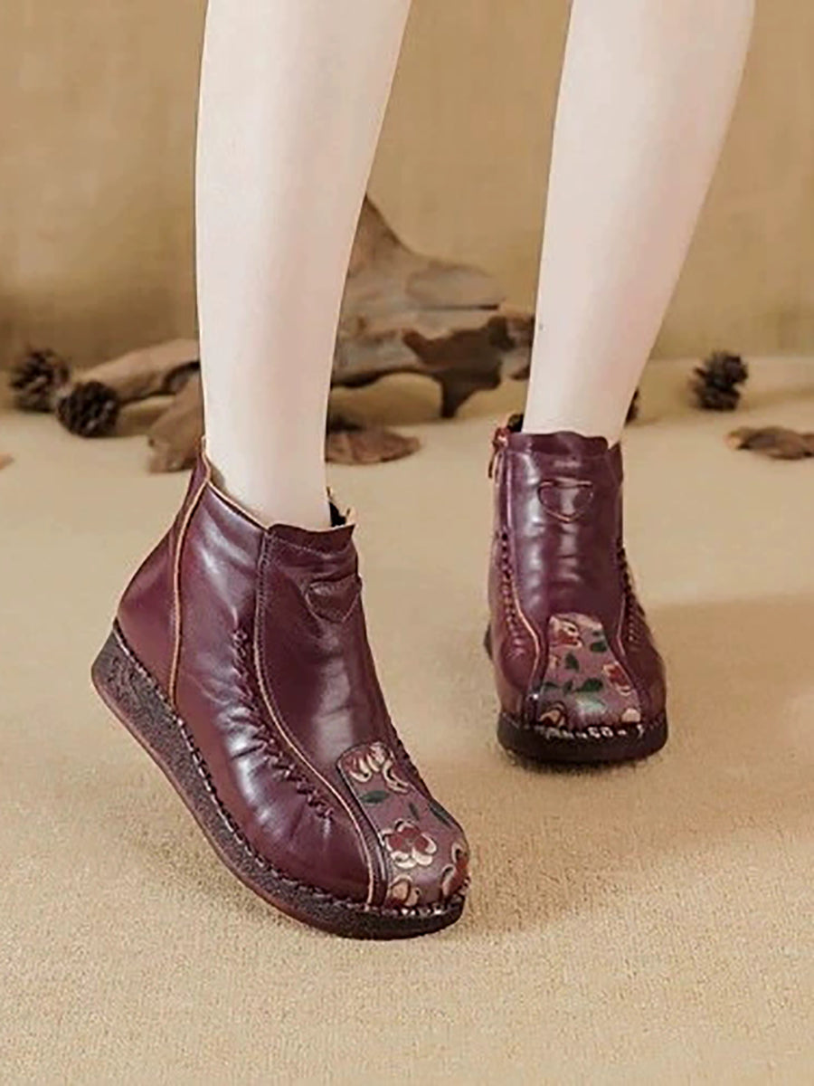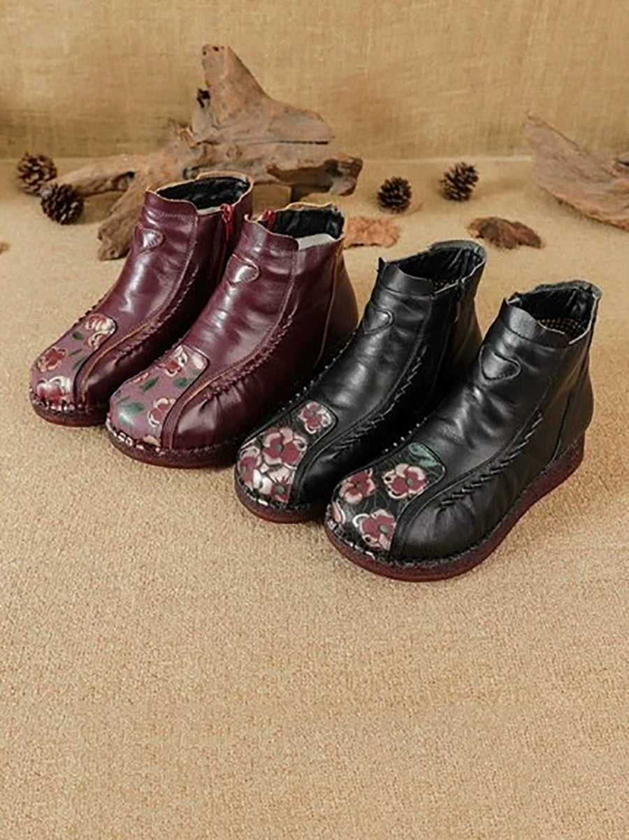 Women Winter Artsy Flower Leather Spliced Ankle Boots