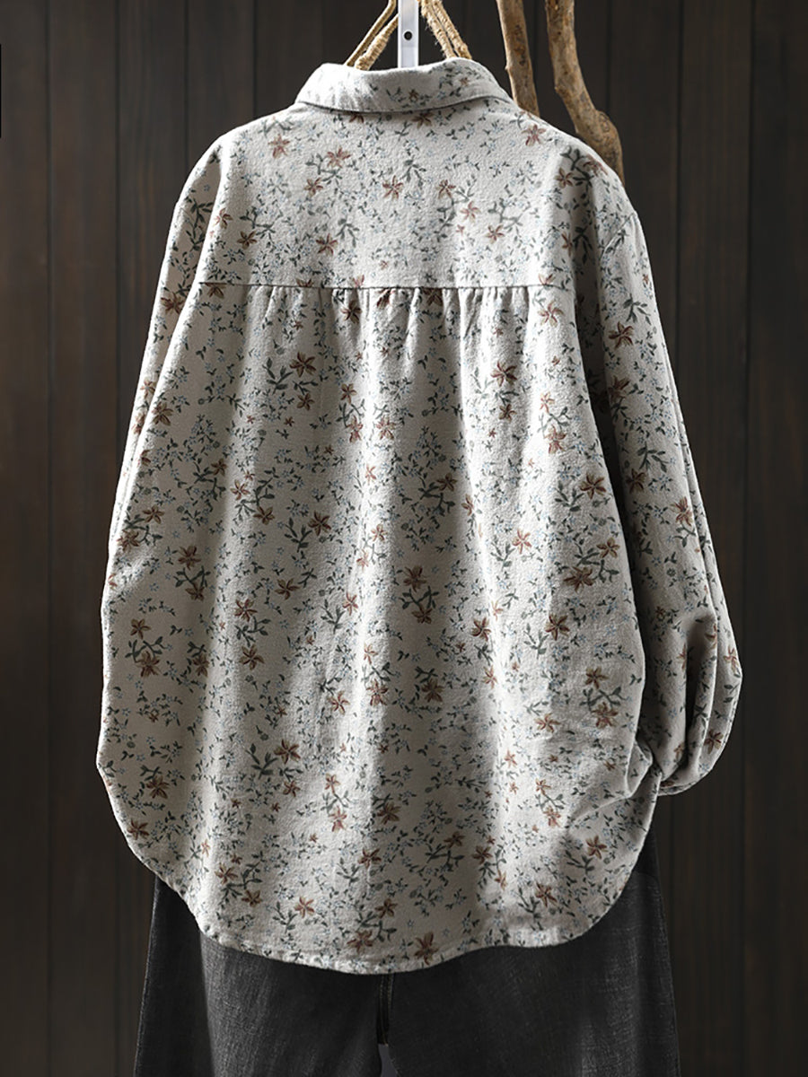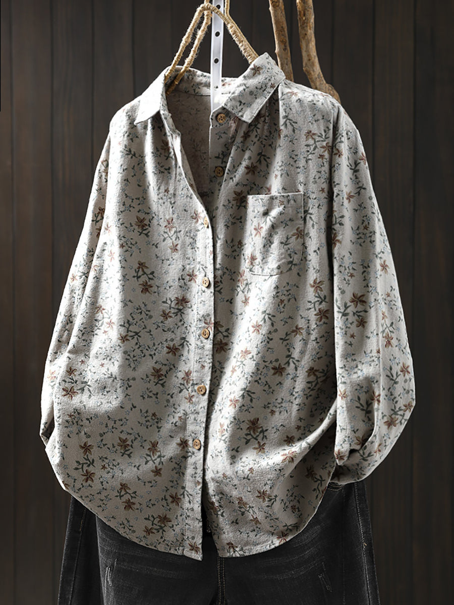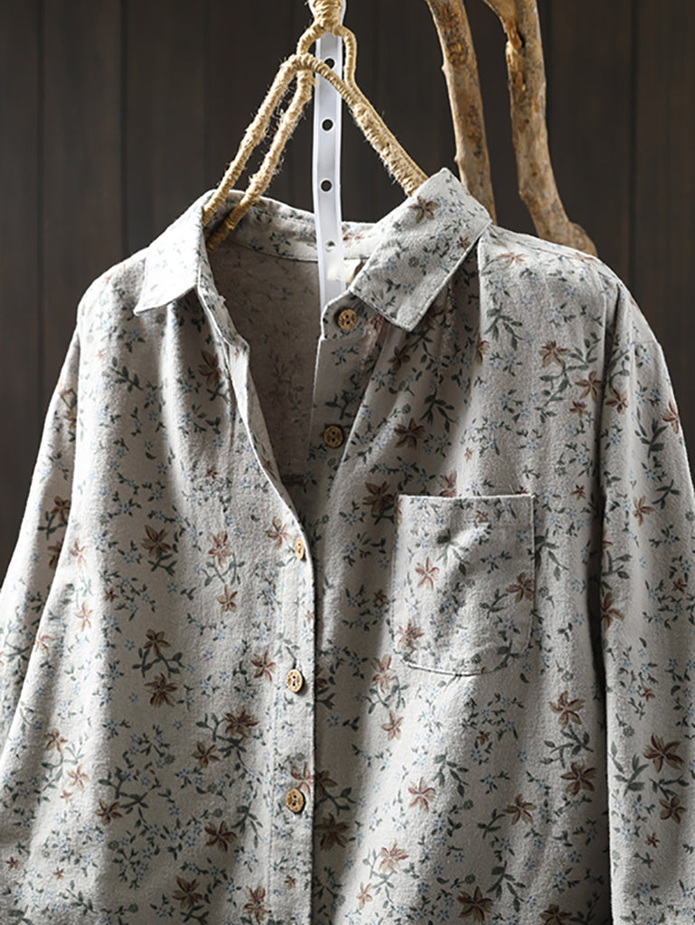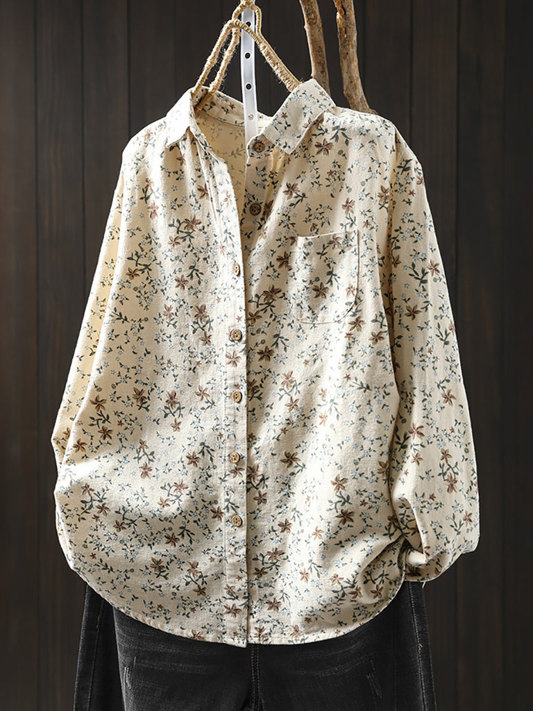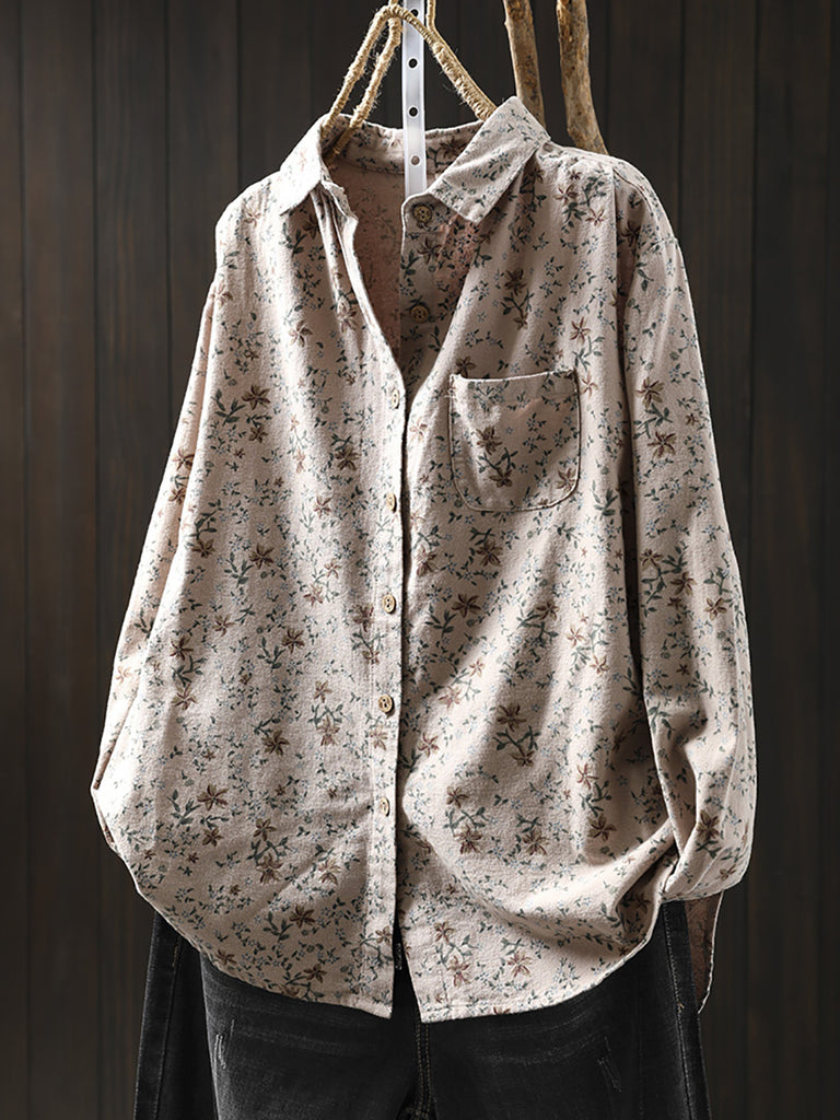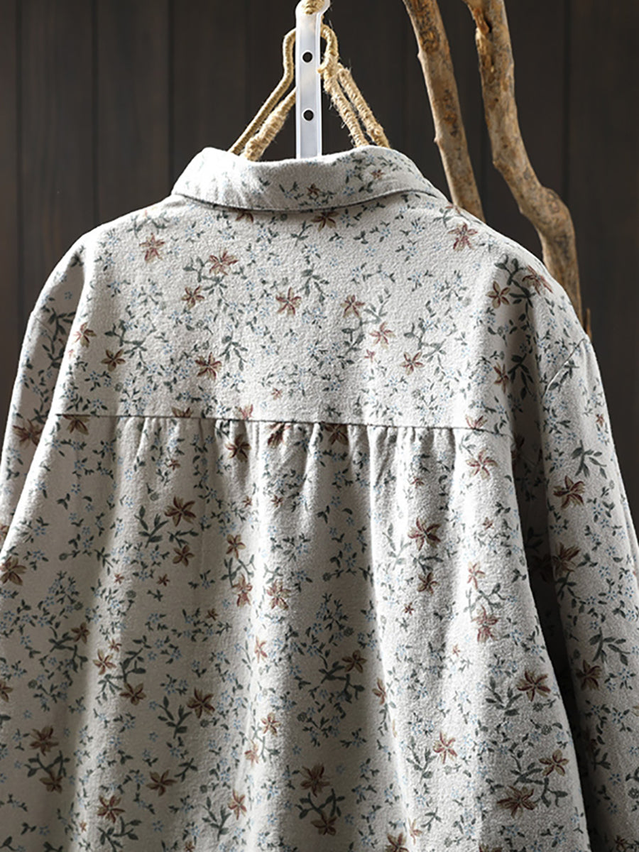 Women Winter Artsy Turn-down Collar Floral 100%Cotton Shirt