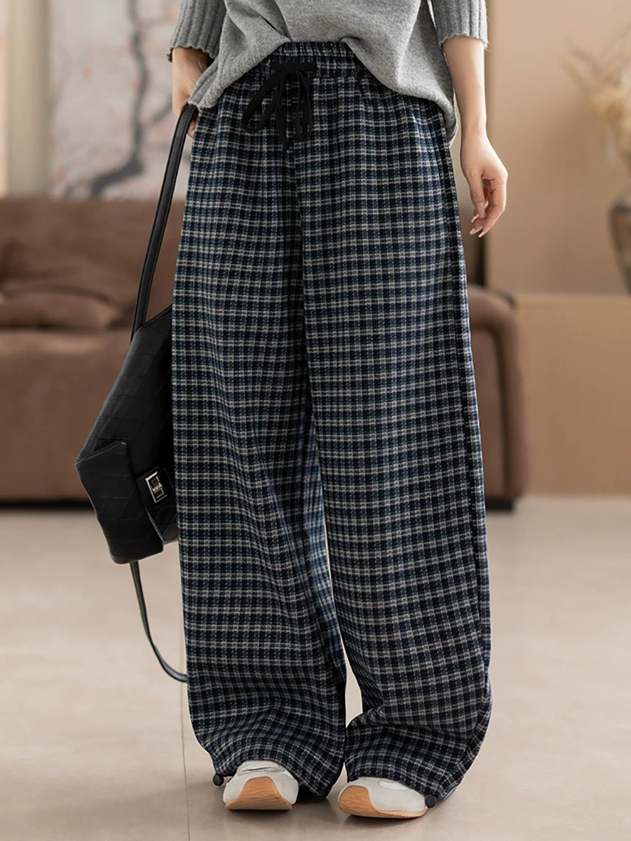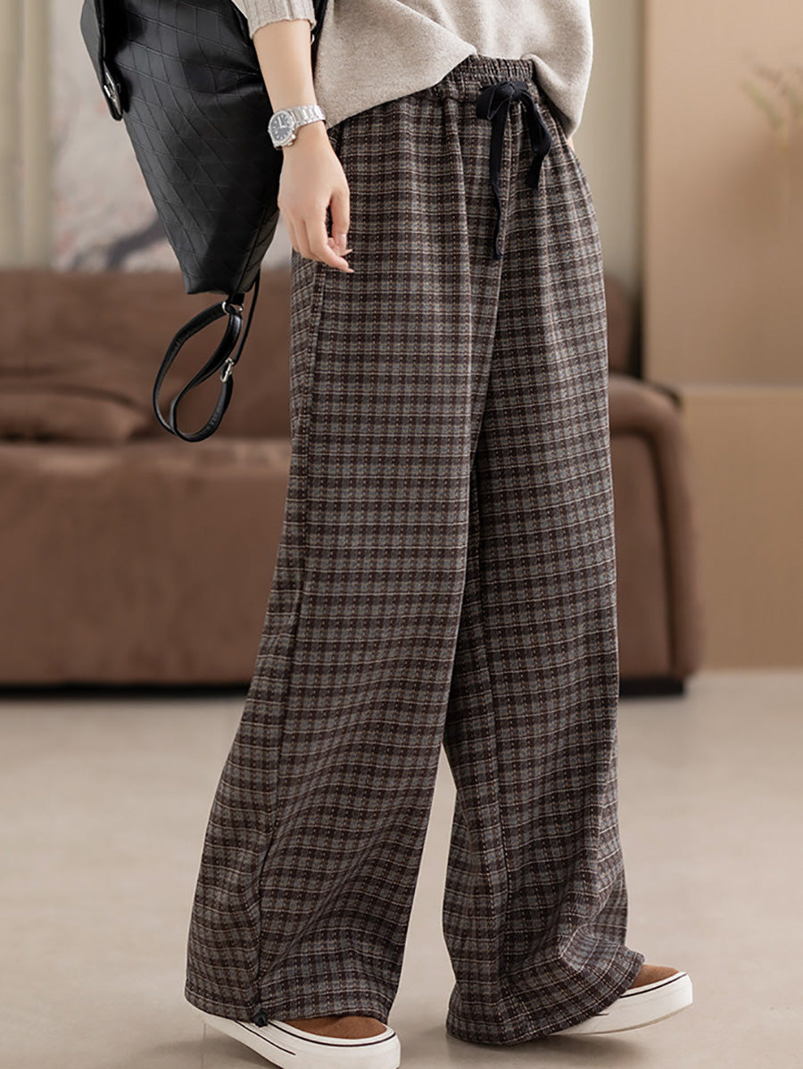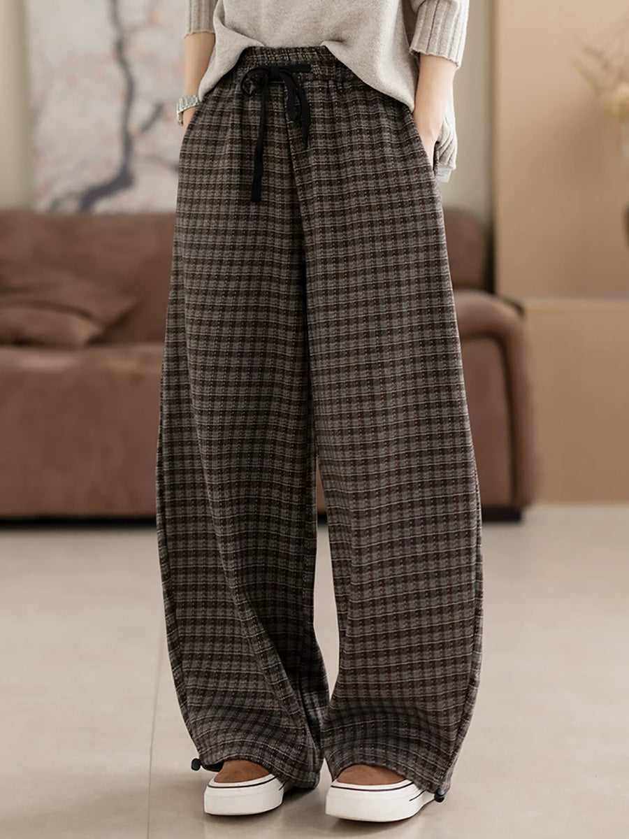 Women Winter Casual Plaid Fleece-lined Wide-leg Pants