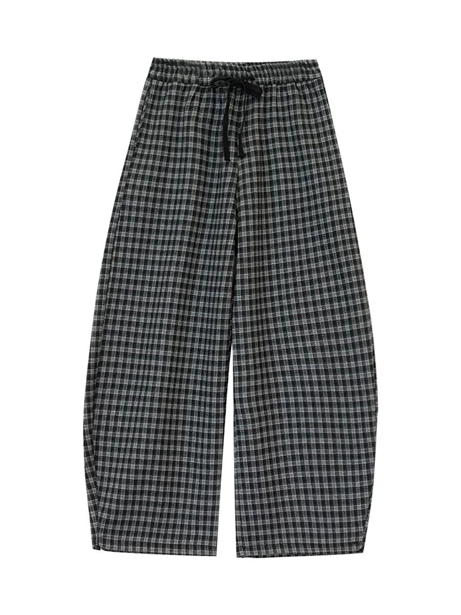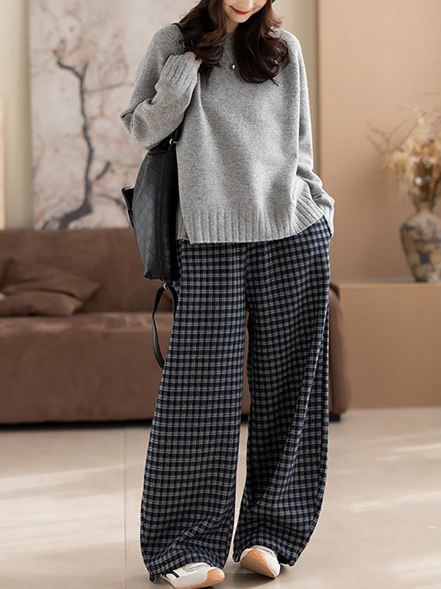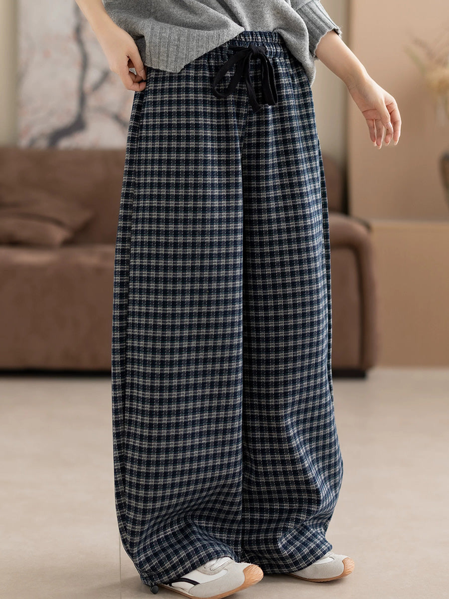 Women Winter Casual Plaid Fleece-lined Wide-leg Pants