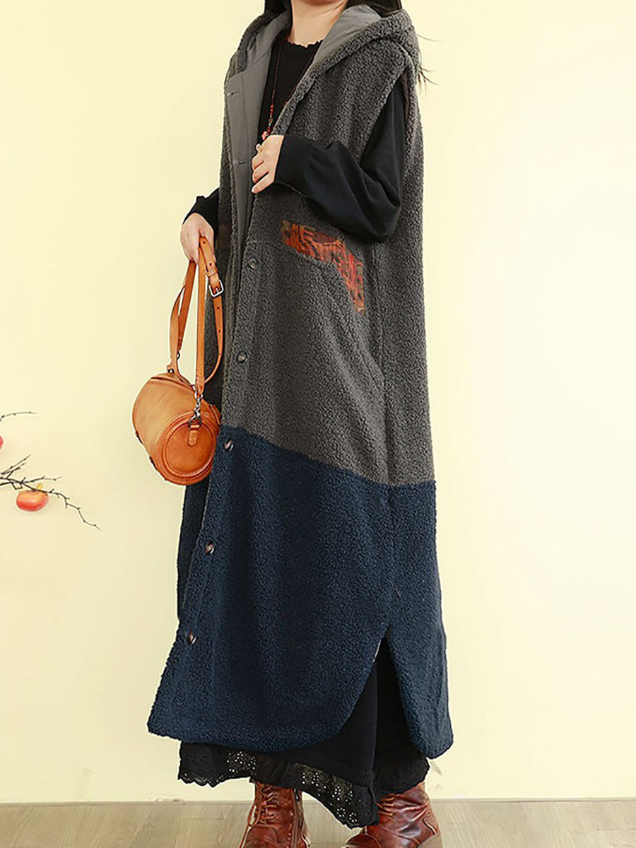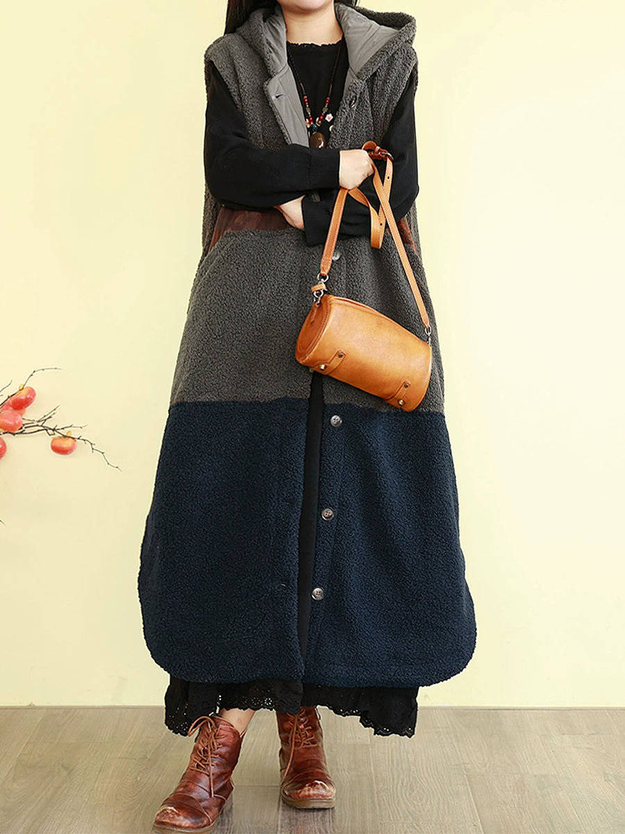 Women Winter Fleece Colorblock Hooded Padded Vest Coat