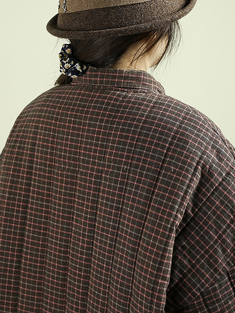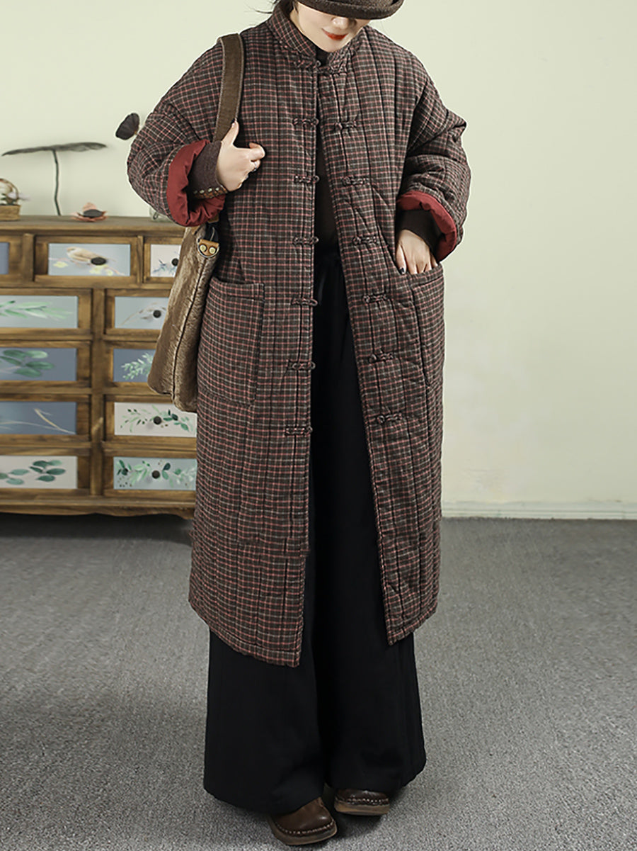 Women Winter Retro Plaid Stand Collar Padded Coat