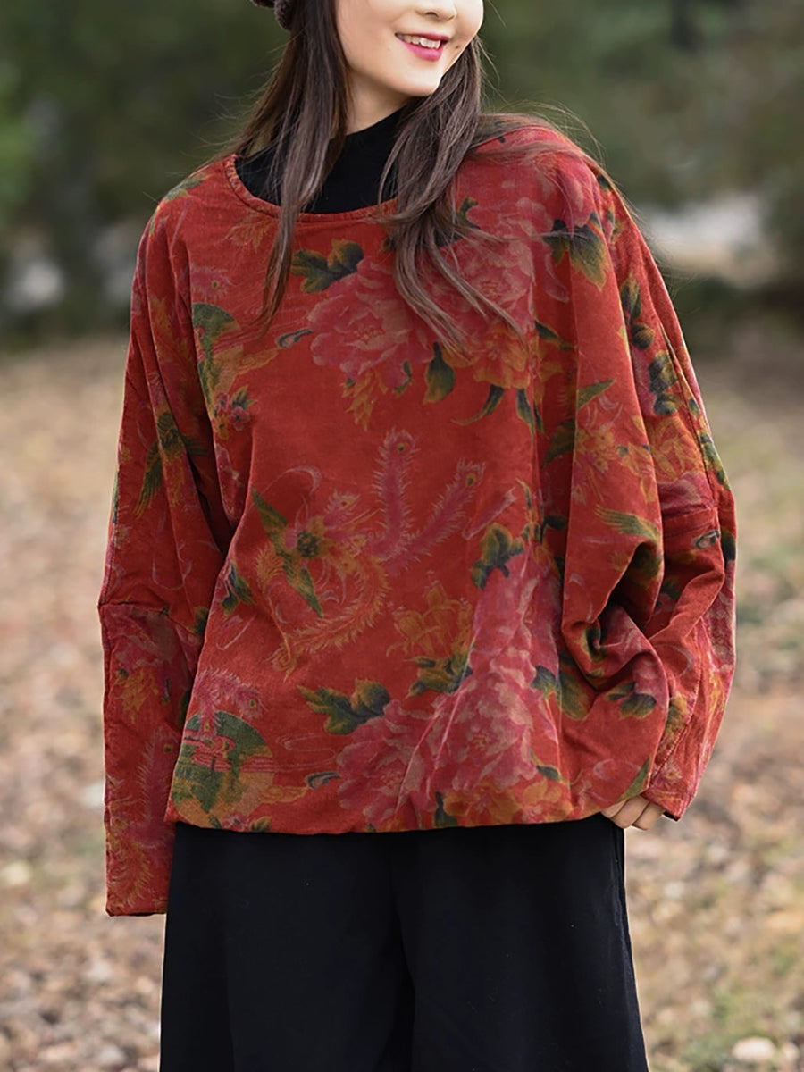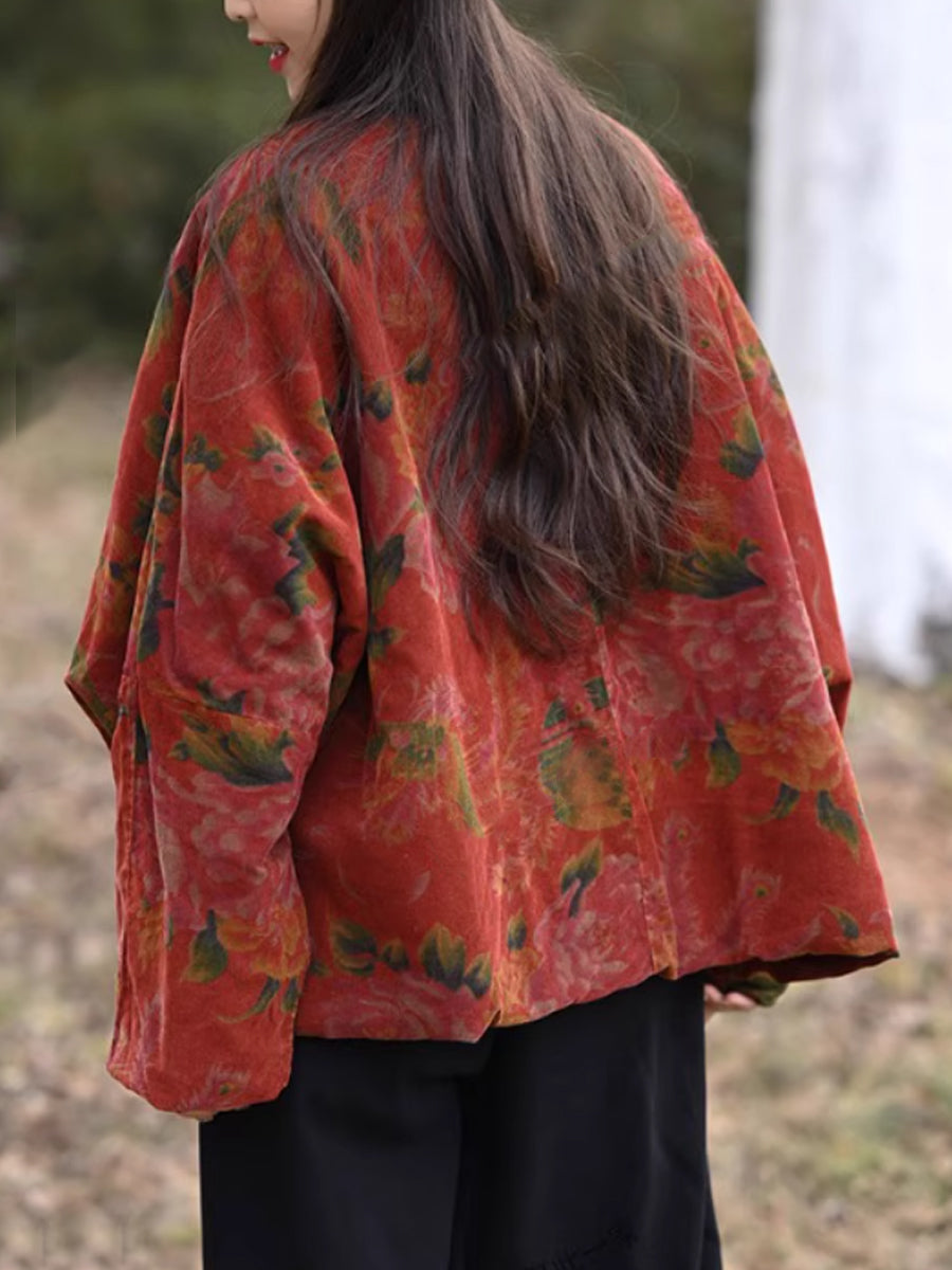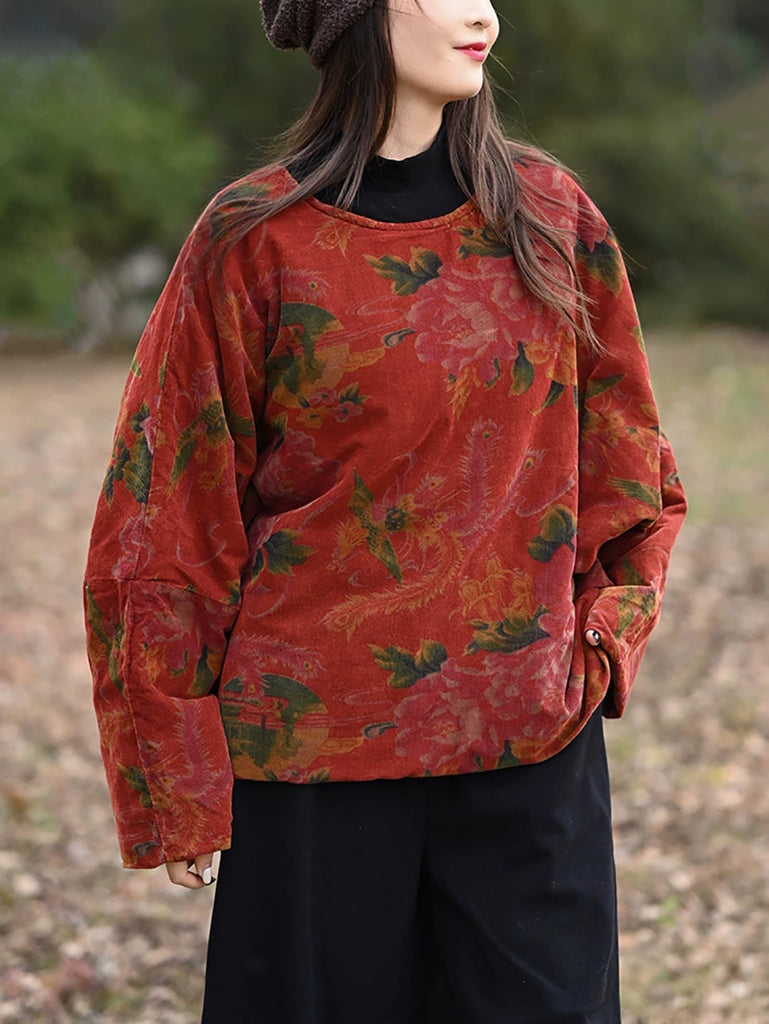 Women Winter Vintage Flower Padded O-Neck Coat