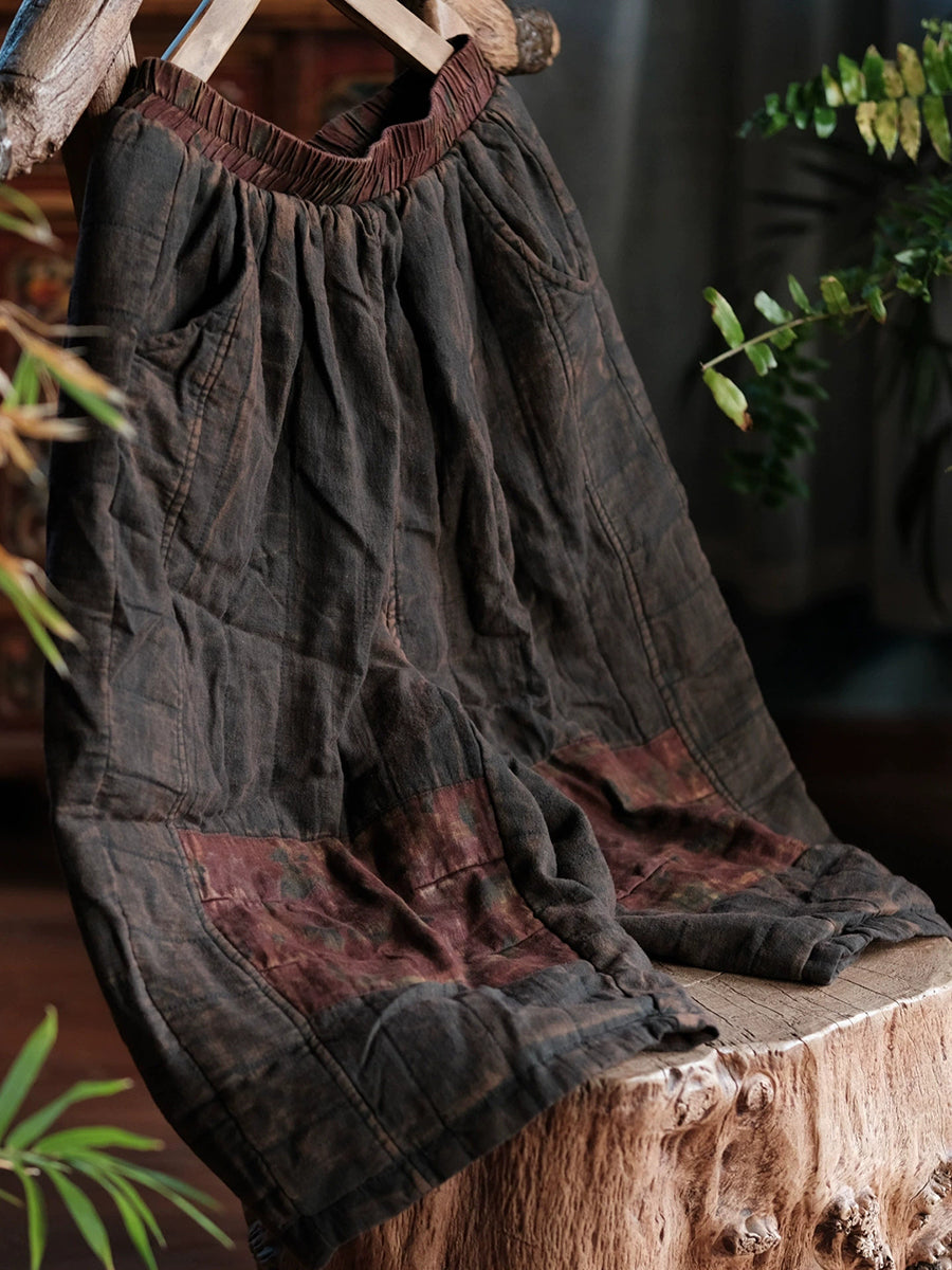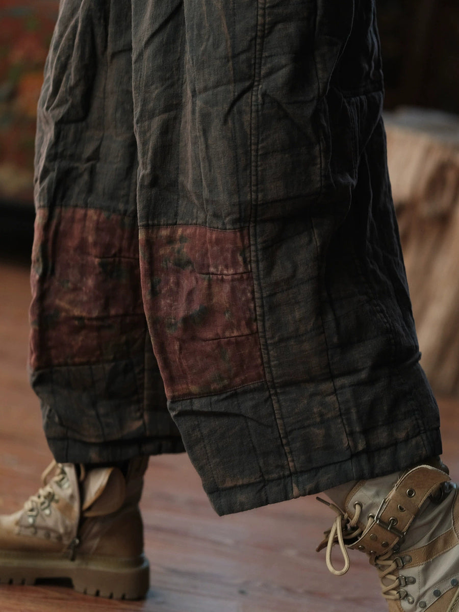 Women Winter Vintage Linen Patchwork Padded Wide-leg Pants