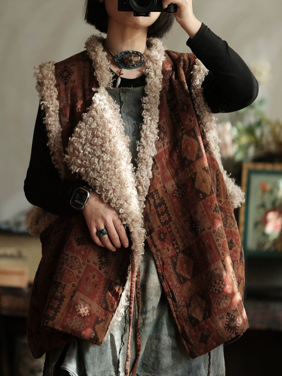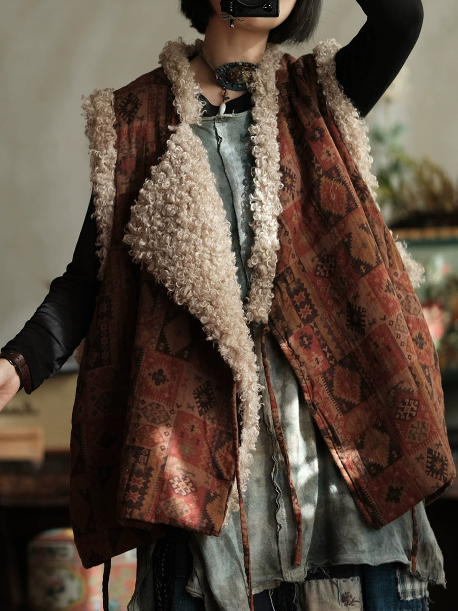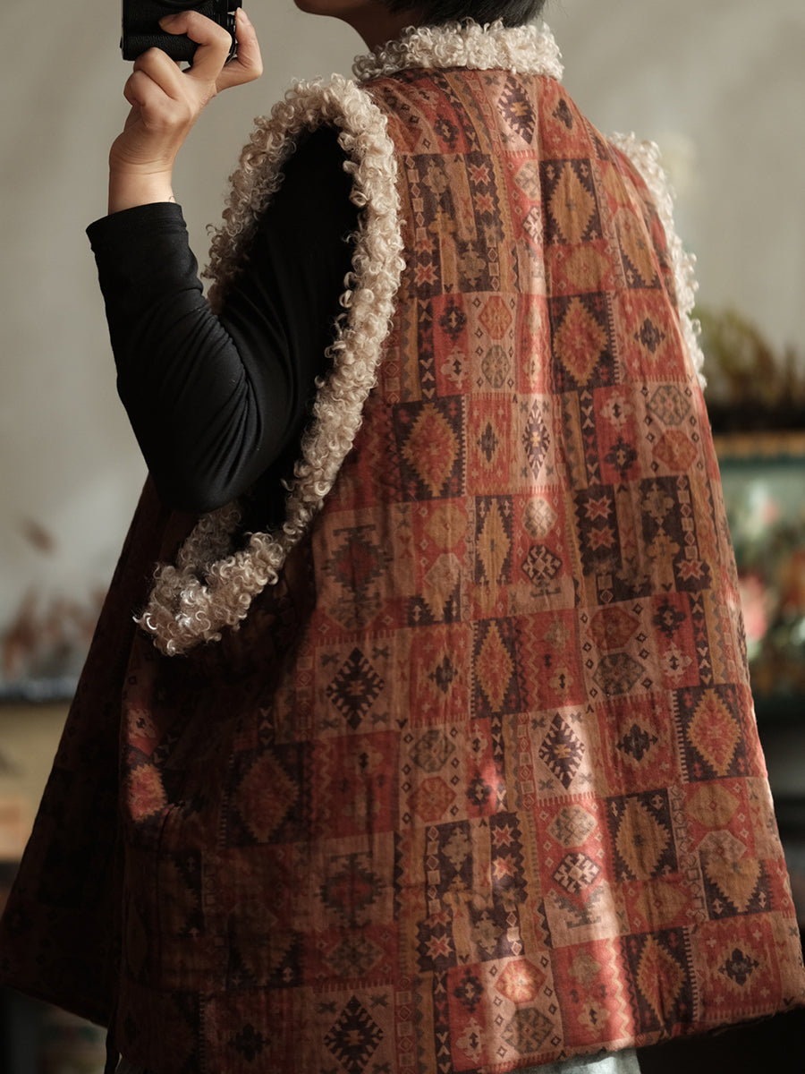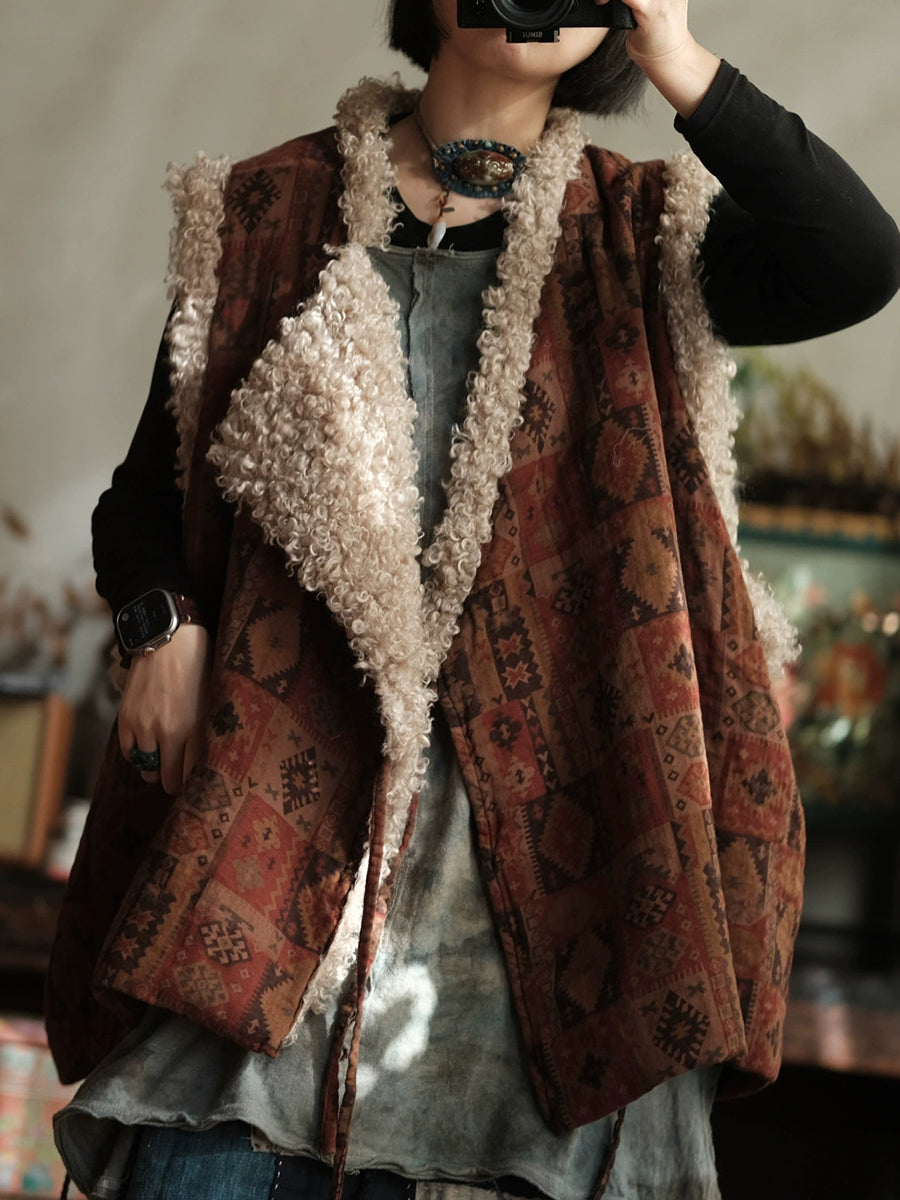 Women Winter Vintage Patchwork V-Neck Fleece Vest